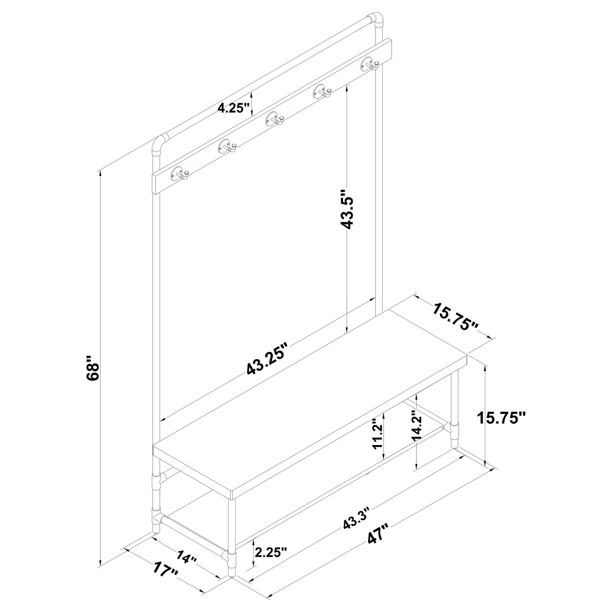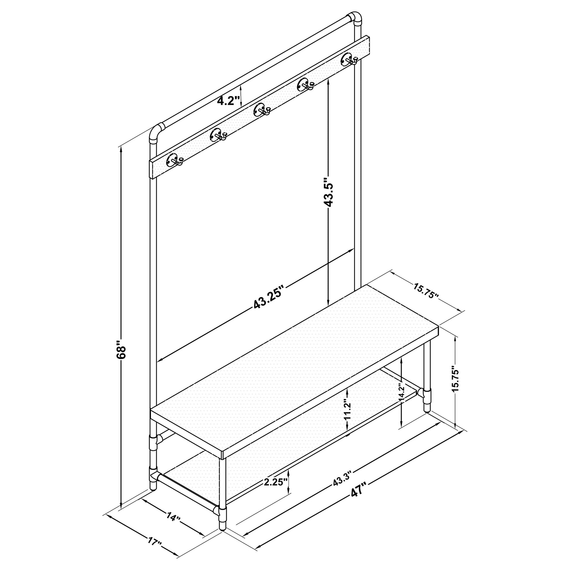 Farmhouse charm brings a fun theme to a traditional space. Perfect for an entryway, this hall tree stops clutter by organizing outerwear and shoes. An industrial-inspired pipe design delivers fresh charm. Hang coats, scarves, and purses on five included hooks, and stash shoes on a lower shelf. With a chestnut finish, this sweet hall tree offers a versatile palette.