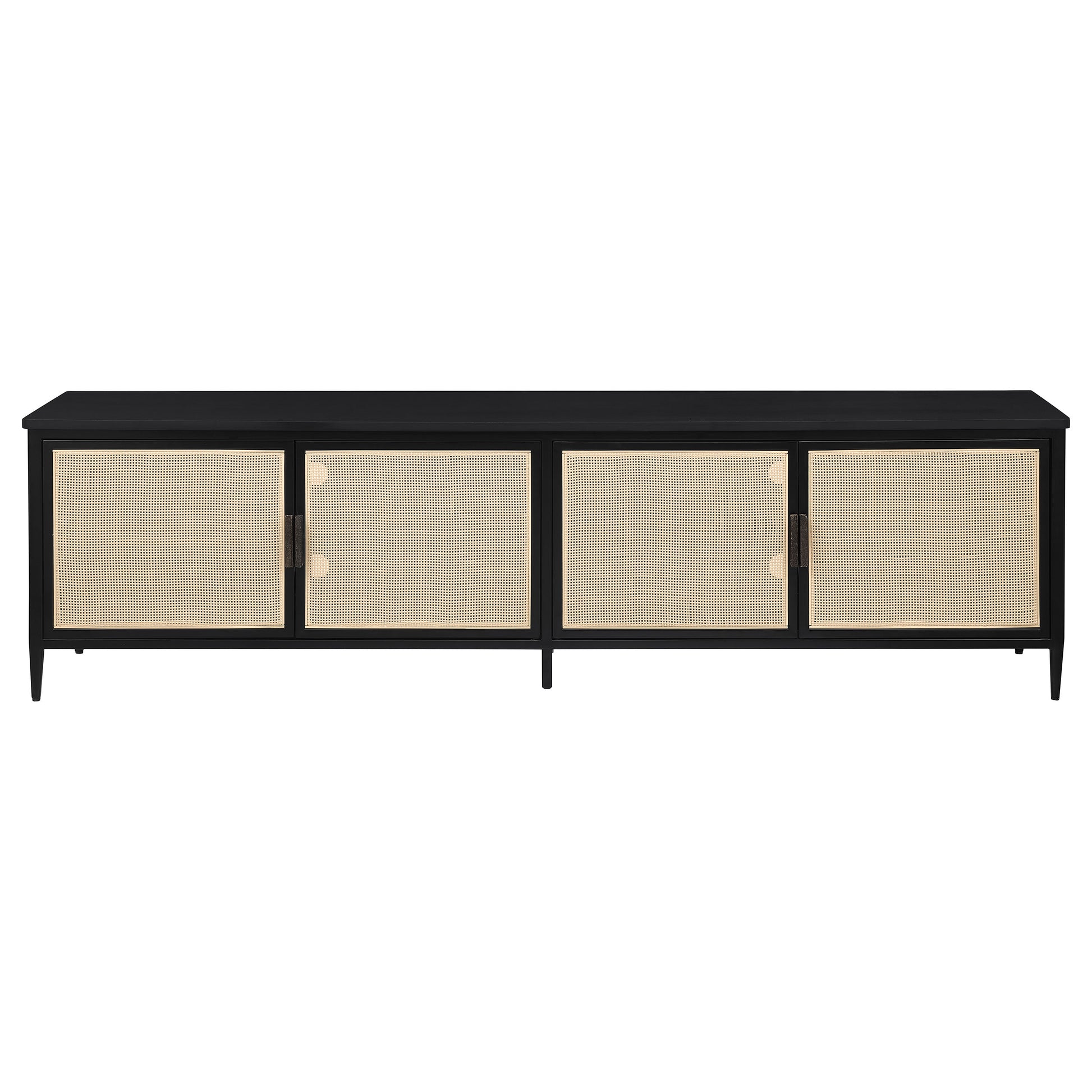 Upgrade your entertainment space with this stunning 78-inch TV stand, designed to accommodate up to an 80-inch TV. Featuring four door cabinets with elegant radio weave polyethylene (PE) rattan fronts, this stand combines modern style with natural texture. The sturdy metal frame, coated with a sleek black powder finish, ensures durability while maintaining a contemporary aesthetic. Inside, two cabinets offer fixed shelving with four total compartments, each equipped with cable access to keep your devices organized and tidy. This TV stand blends style and practicality, making it a perfect addition to any sophisticated living room.