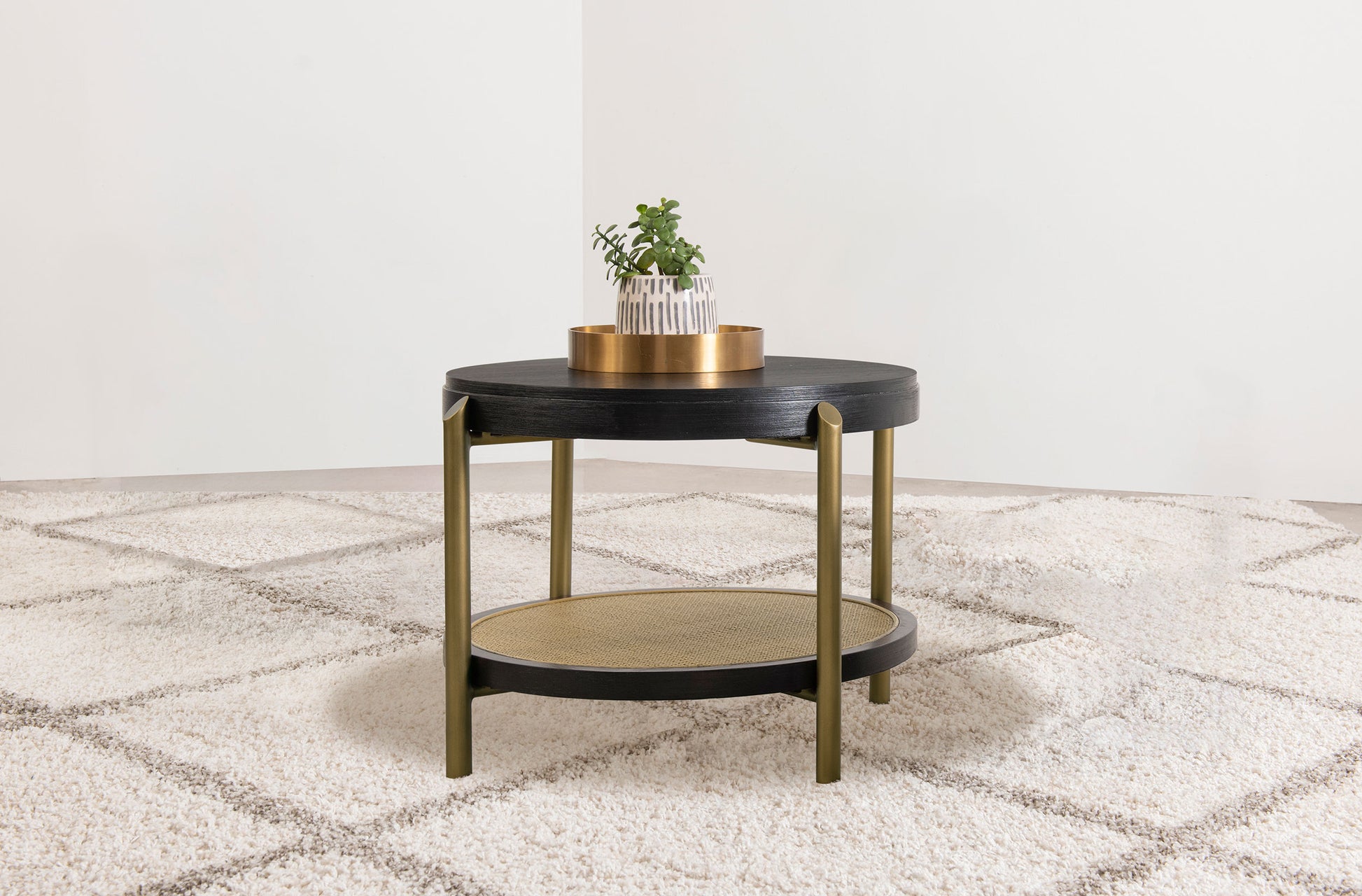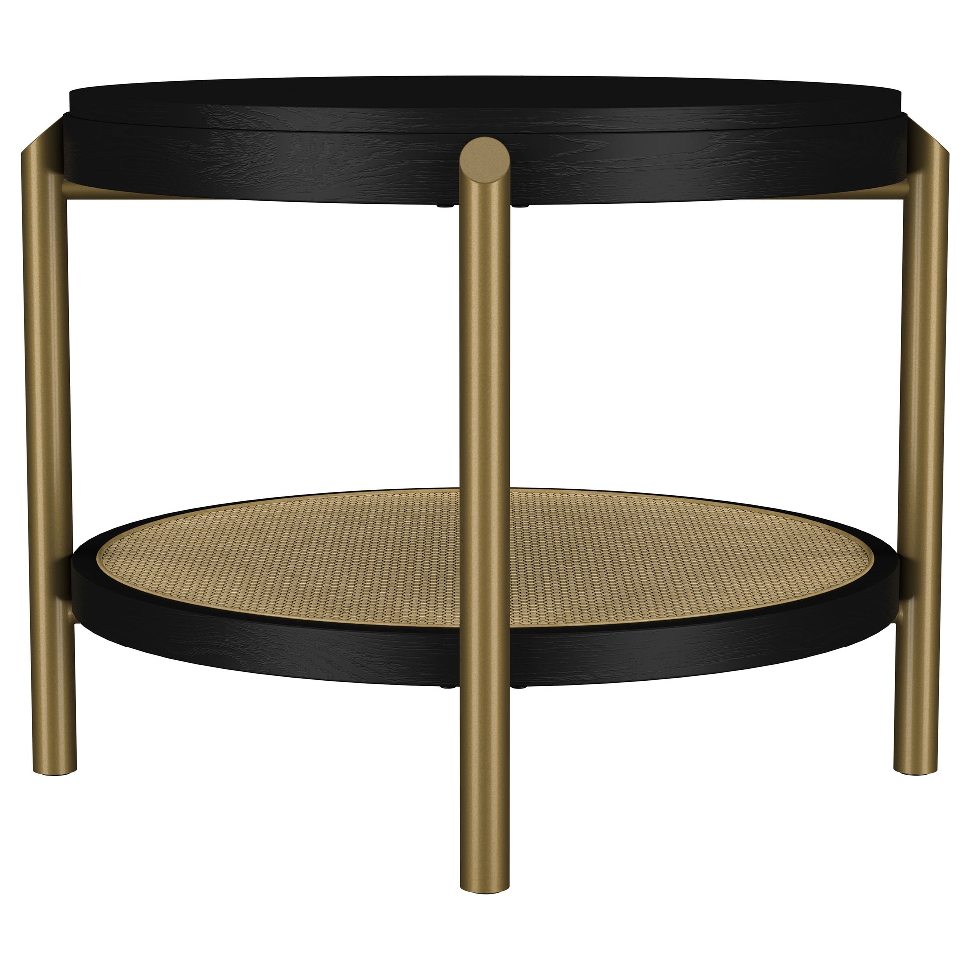 This round end table showcases a refined blend of natural and industrial elements, perfect for modern interiors. Crafted from rubberwood, engineered wood, and white ash veneer, its finish highlights the table's organic grain for a subtle, rustic appeal. The lower shelf features natural woven rattan, offering functional storage with a stylish touch. Sturdy aged brass-finished metal legs provide contrast and durability. Ideal as a side table or accent piece, it combines elegance and utility effortlessly.