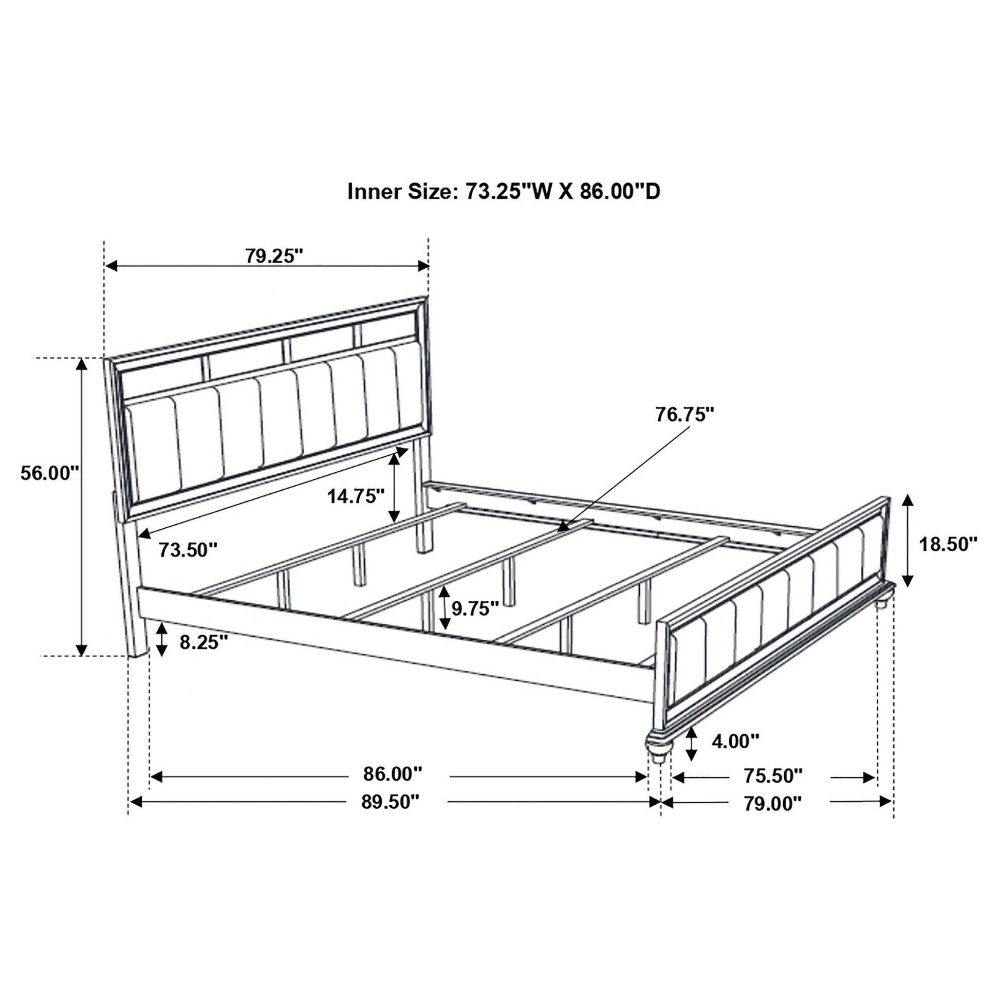 Perfectly suited for more transitional bedrooms, this four-piece bedroom set includes a panel bed frame, single two-drawer nightstand, and seven-drawer dresser with mirror, all in a crisp white finish with shiny metal hardware with faceted crystal accents. The paneled headboard and footboard offer channel tufted paneling wrapped in a metallic leatherette upholstery. Other extra touches include frame molding, turned feet, and felt lined top drawers. The nightstand offers a convenient power outlet for charging devices before bed. Place this bedroom set in a home to lend a more glamorous vibe.