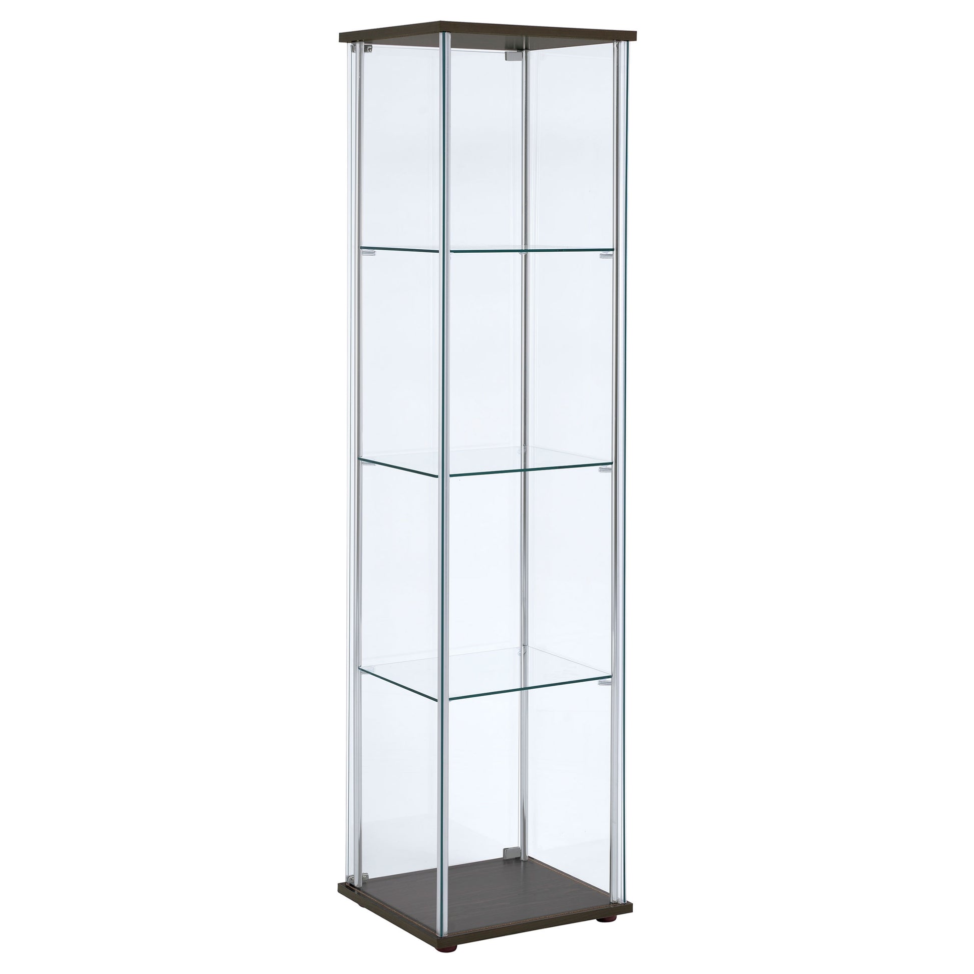 • Four shelf curio cabinet in cappuccino, clear tempered glass shelving, chrome metal accents