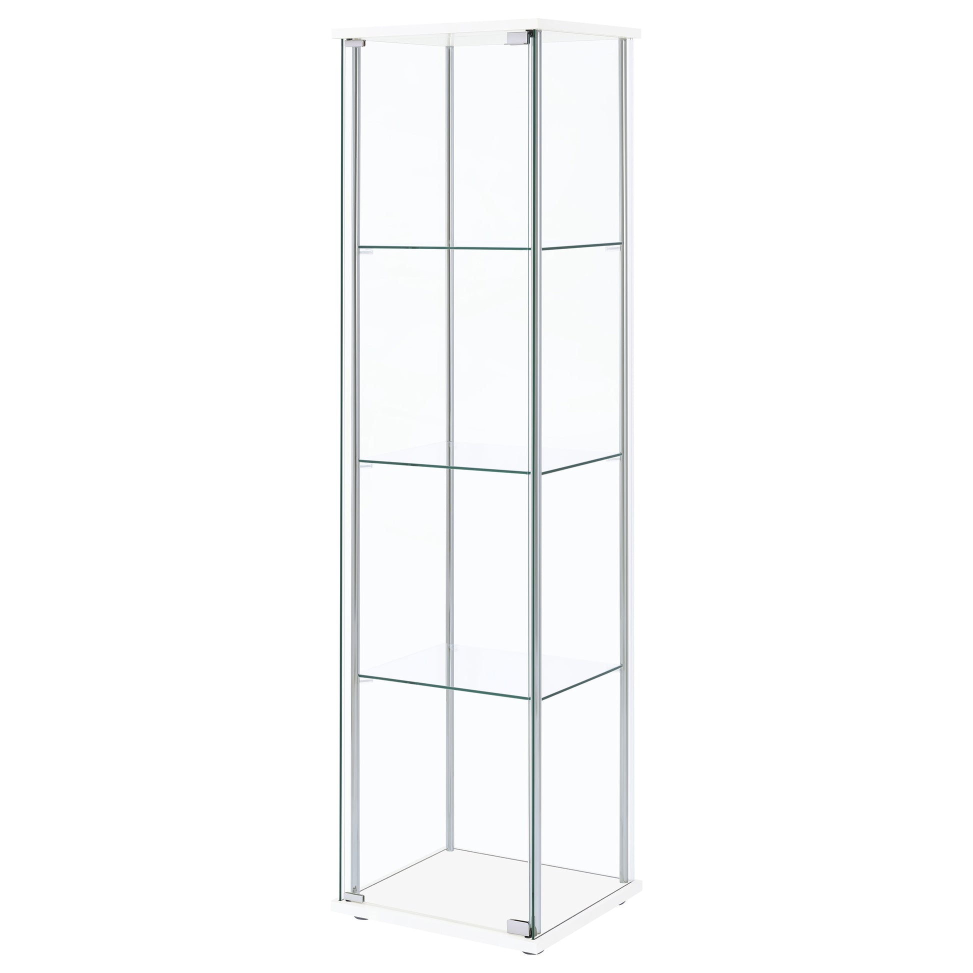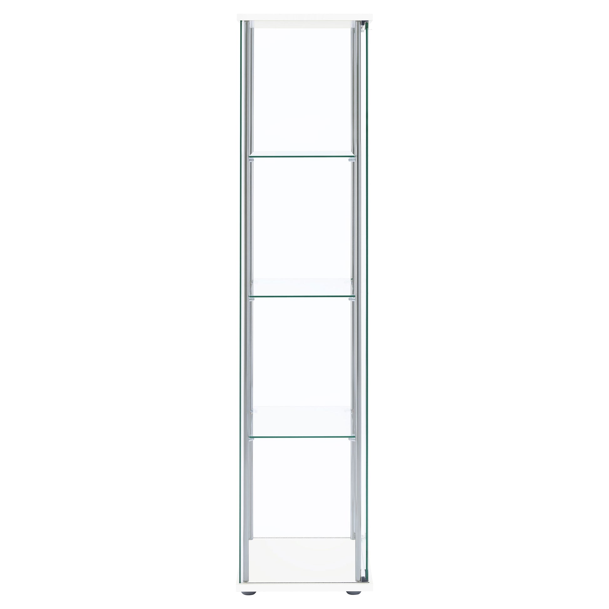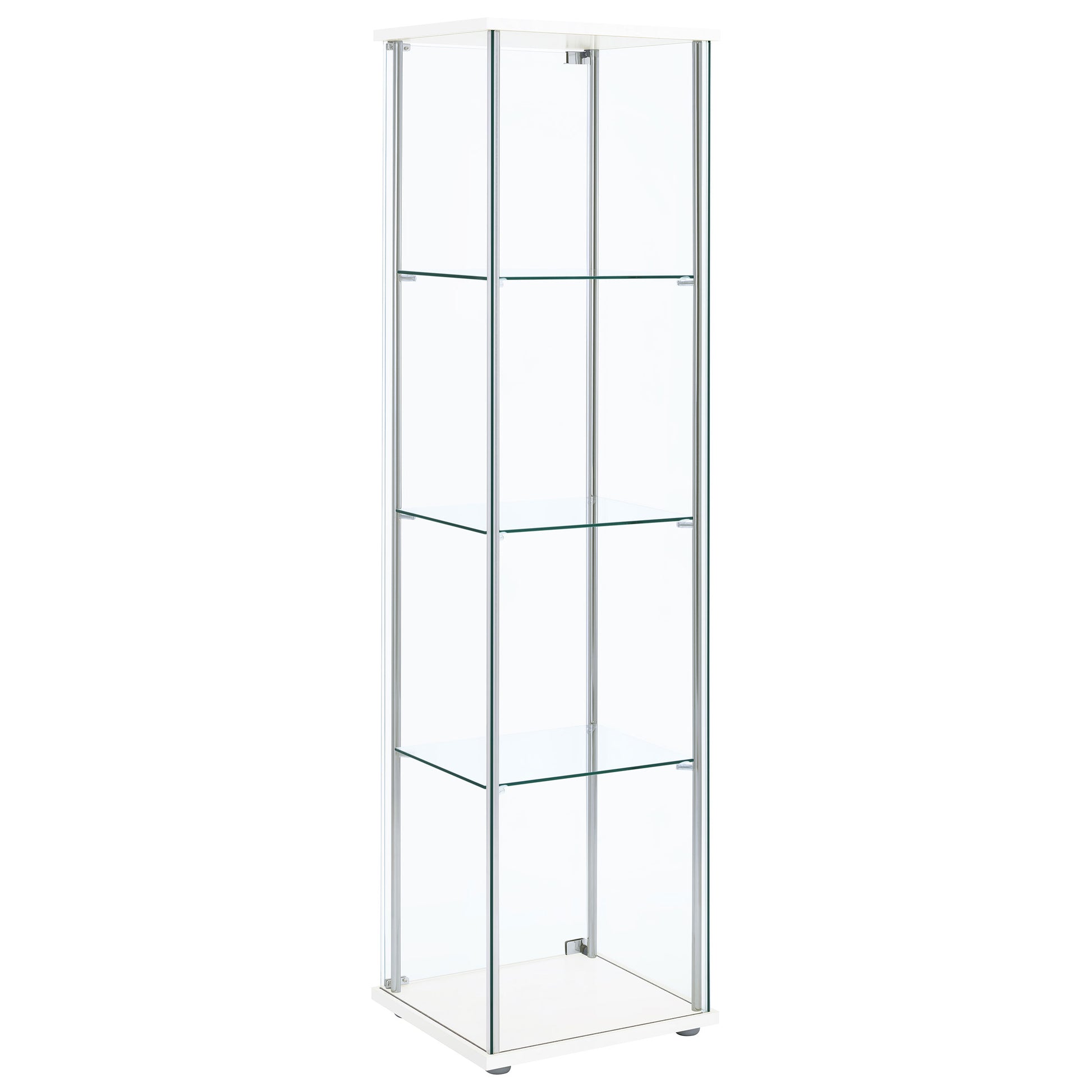 • Four shelf curio cabinet in white, tempered glass shelves, chrome tone accents, tall profile