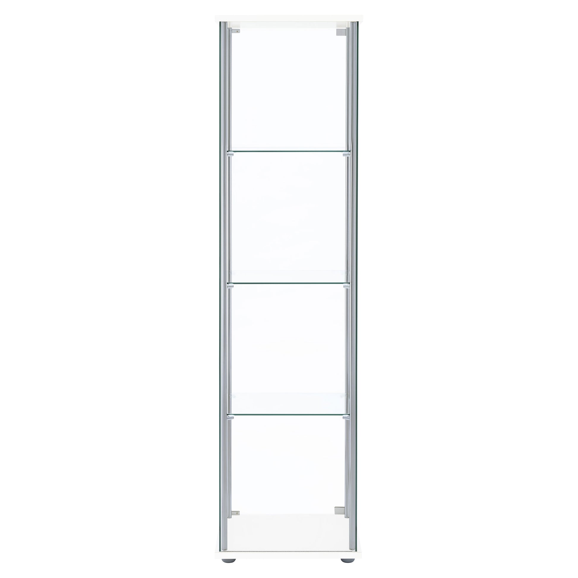 This curio cabinet blends modern simplicity with timeless display function, offering a tall, streamlined silhouette. Clear tempered glass panels and three sturdy shelves create an airy showcase for treasured keepsakes. Chrome tone supports frame the design with contemporary flair, while a rectangular top and base add subtle stability. Crafted with glass, engineered wood, and laminate veneer, this cabinet serves as both storage and statement in living or dining spaces.