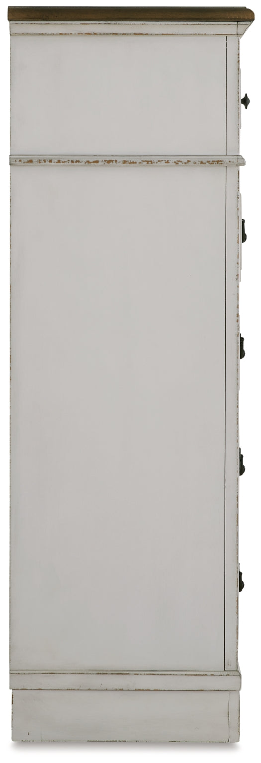 Details | Made with hardwood solids, select wood veneer and MDF substrate, Two-tone finish (chipped white and brown wood-tone), Profiled drawer fronts and pilasters, Waist moulding, Metal hardware with dark bronze-tone finish, 5 smooth-gliding drawers with fully finished interiors, dovetail construction and metal ball-bearing side glides (top drawer felt lined), Assembly required | |