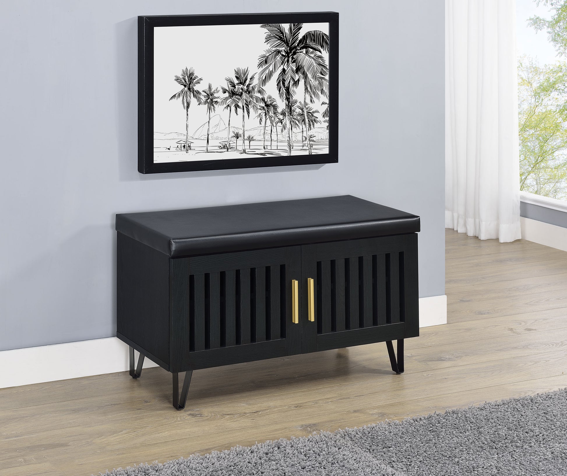 • Storage bench in black finish and matte gold handles for a modern touch