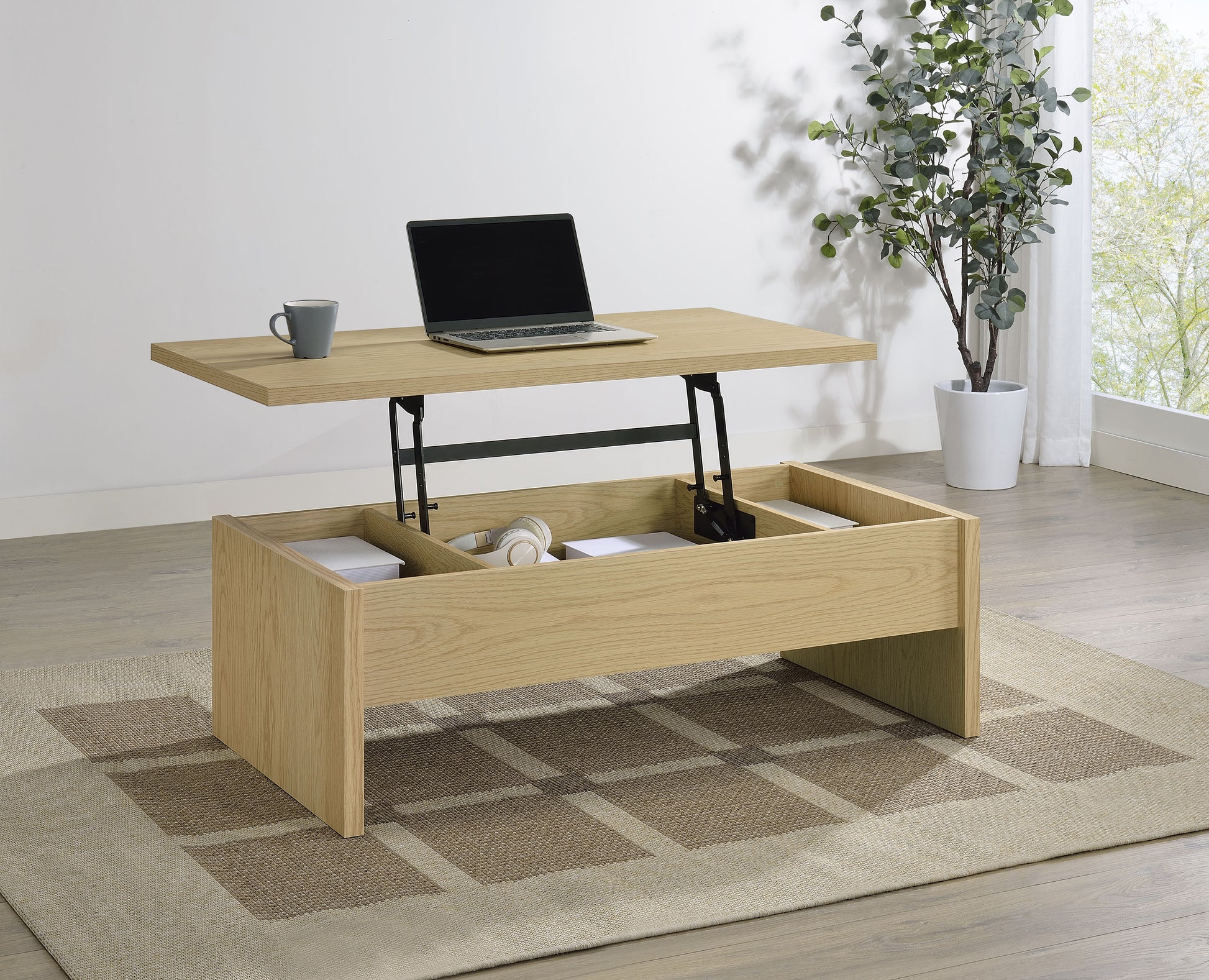 • Lift-top coffee table with smooth pop-up mechanism for concealed interior storage