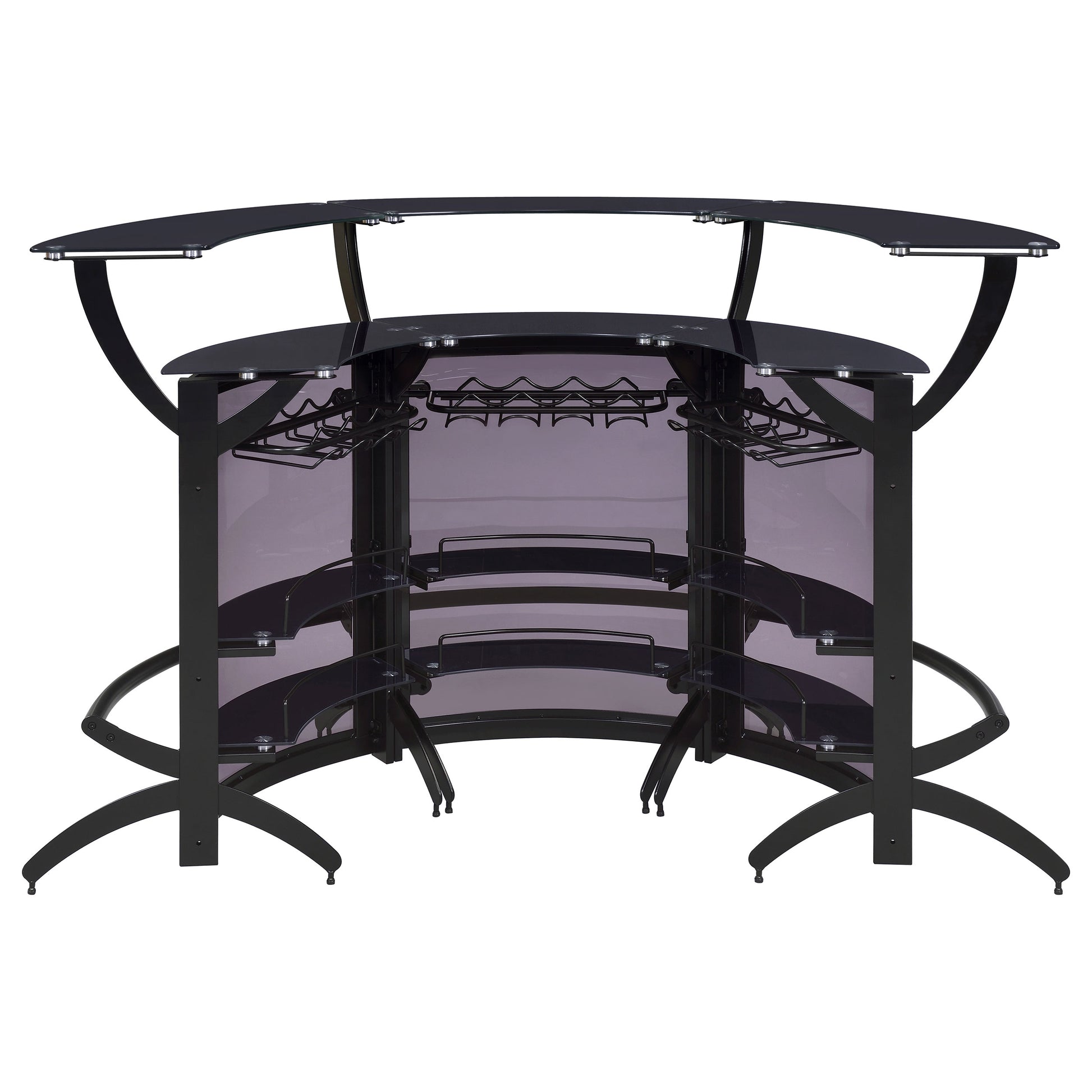 Presenting plenty of contemporary vibes, this home bar is sleek in every aspect. The black finish and acrylic construction give this piece an upscale look and feel. A rounded design offers storage space on multiple shelving units. Also included on this contemporary bar table are stemware racks to hold plenty of wine glasses. Whether you are entertaining a party of two or many, this contemporary bar table is the right choice for a stylish home.