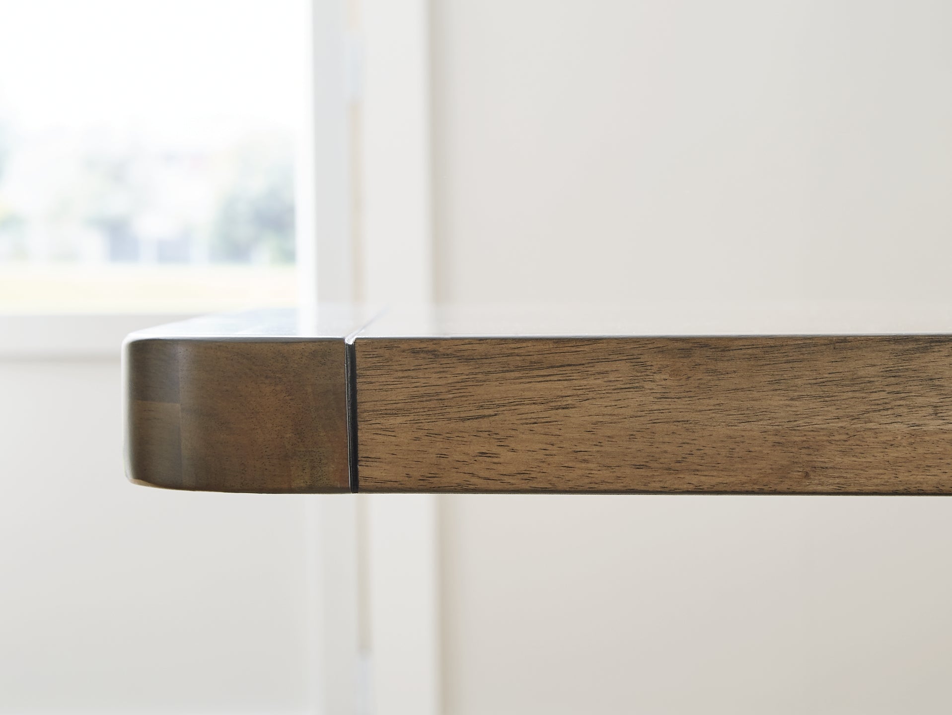 This dining package sits comfortably at the intersection of modern lodge and farmhouse aesthetics. Your warm and welcoming disposition is reflected in the charming architectural elements and light brown glazed finish. Even with its poise, the set remains practical, defining your dining room with reliable function and style.