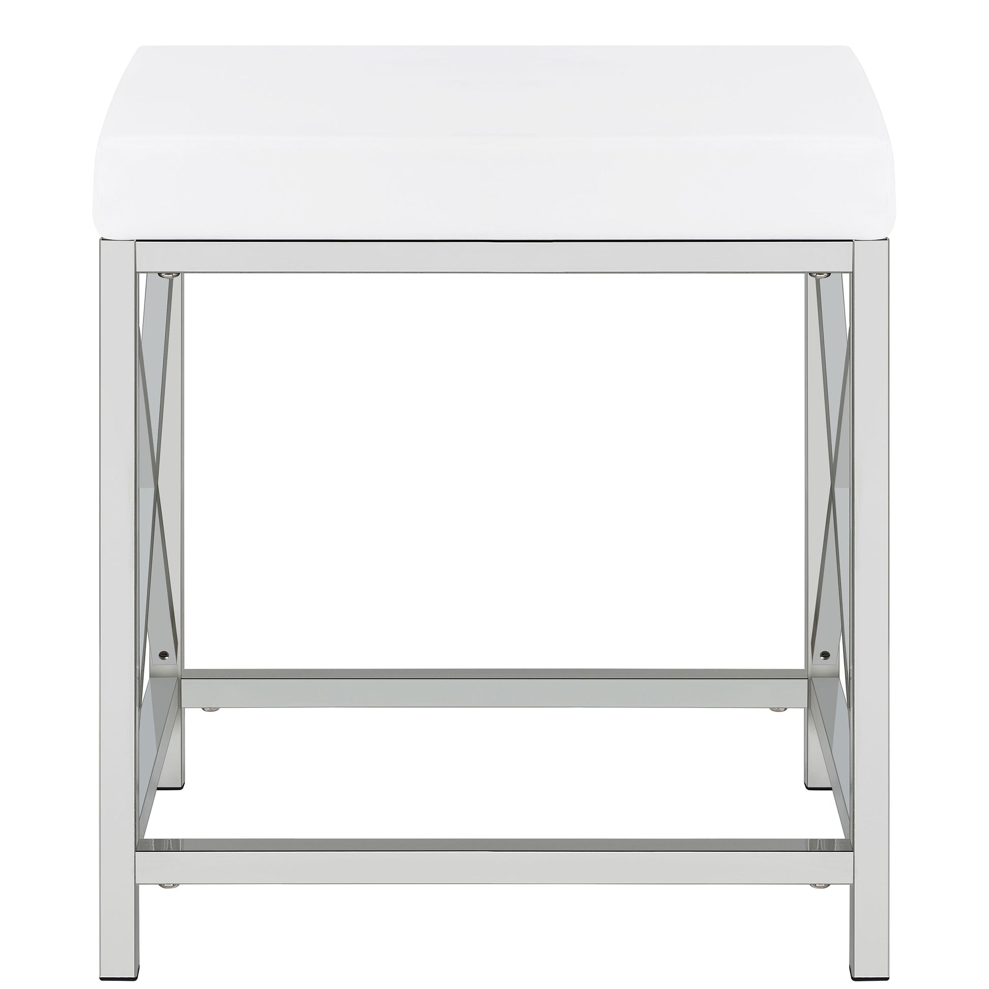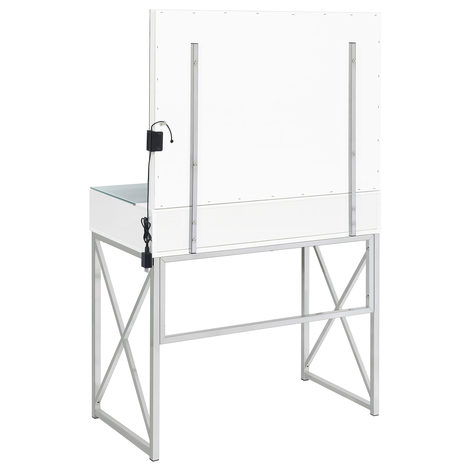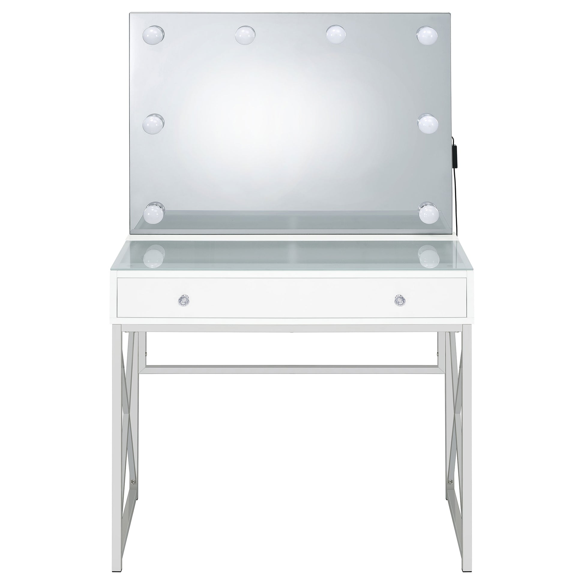 Elevate your morning rituals with a compact, contemporary vanity set, including table, mirror and stool. Perfect for makeup and hair, the vanity shows off a bright white finish with a large drawer for stashing your daily necessities. On top, a lighted mirror adds Hollywood glamour while providing bright illumination so you can see every detail as you get ready for everything from running errands to a girl's night out. The desk is accompanied by a backless stool, providing an easy spot to sit as you prepare for the day. The stool features a base with X-shaped braces to match the desk and includes a white faux leather seat with lovely padding that starts your day on the right foot.