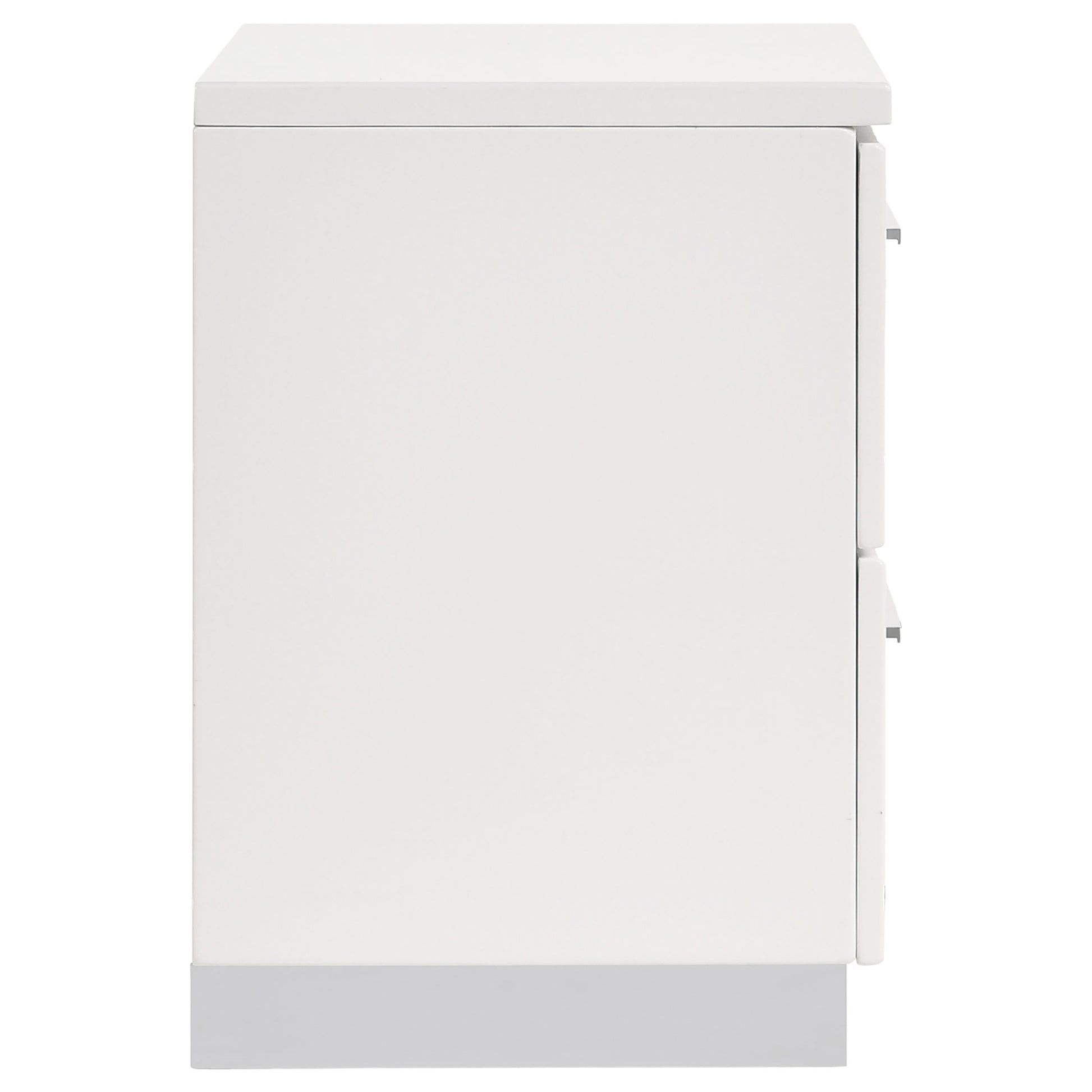 Add functional style to your bedroom with this modern 2-drawer nightstand. Finished in a bright white high gloss, it offers a clean, polished look that complements contemporary interiors. Chrome-finished metal handles and feet provide a refined accent, while metal extension glides ensure smooth drawer operation. Designed for everyday use, this compact storage unit blends durability with a sleek aesthetic.