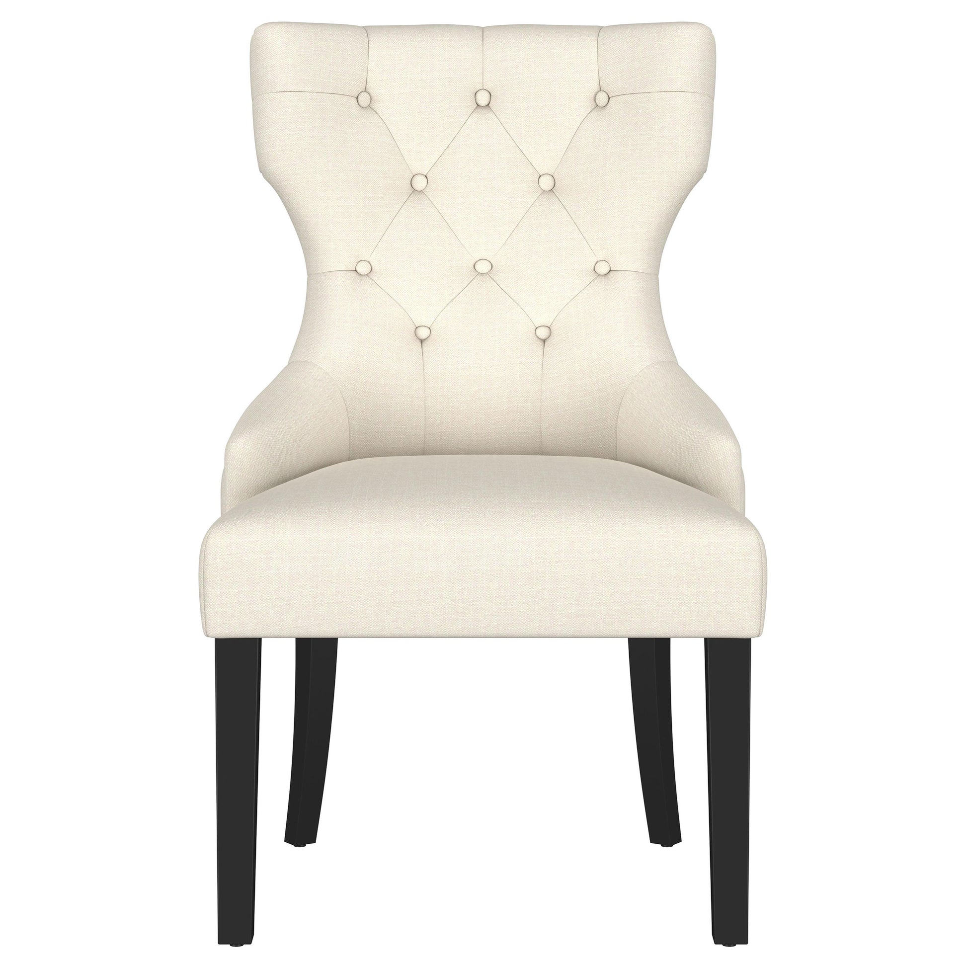 • Beige fabric upholstered tufted dining chairs with a classic wingback silhouette provide both comfort and style