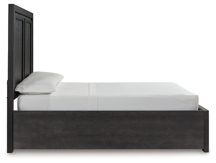 Includes queen panel headboard, storage footboard, and rails with roll slats, Made with hardwood solids, select oak veneers and engineered wood, Two-tone finish (brushed black and dusty grayish brown wood tone), Headboard with picture frame moulding, Footboard with two deep drawers, Smooth-gliding soft-close drawers with fully finished interiors and dovetail construction, Sleek drawer pulls with black finish, Bed does not require additional foundation/box spring; accommodates most zero clearance adjustable bases with the addition of a bunkie board, Mattress available, sold separately, Assembly required