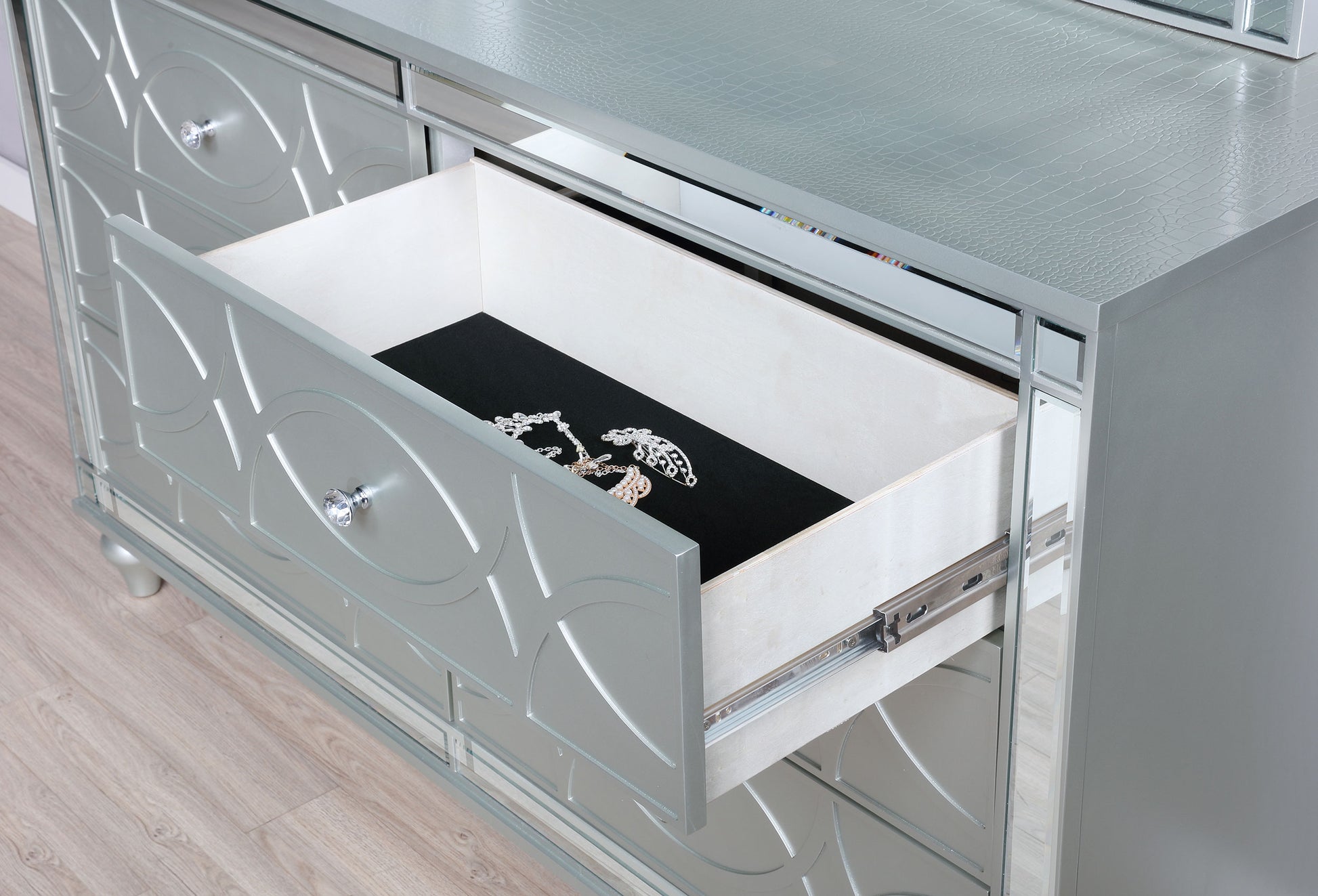 • Six-drawer dresser with silver metallic frame and mirrored trim