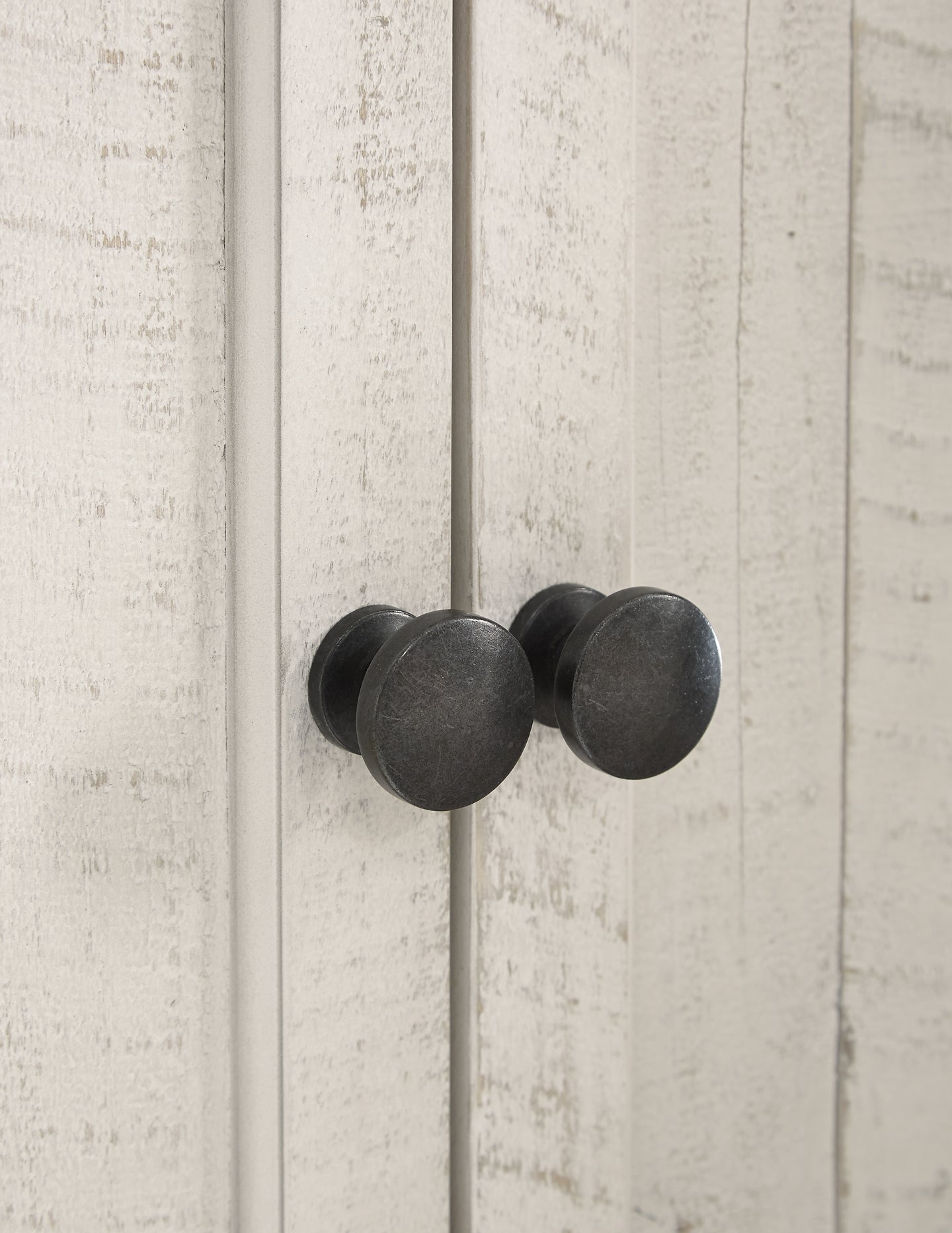 | Details | Made of pine wood, pine veneers and engineered wood, Two-tone distressed finish: weathered gray top; vintage white base, TV stand with 2-door cabinet with single-shelf storage and 2 open shelves, Aged iron-color hardware, Cutouts for wire management, Assembly required | |