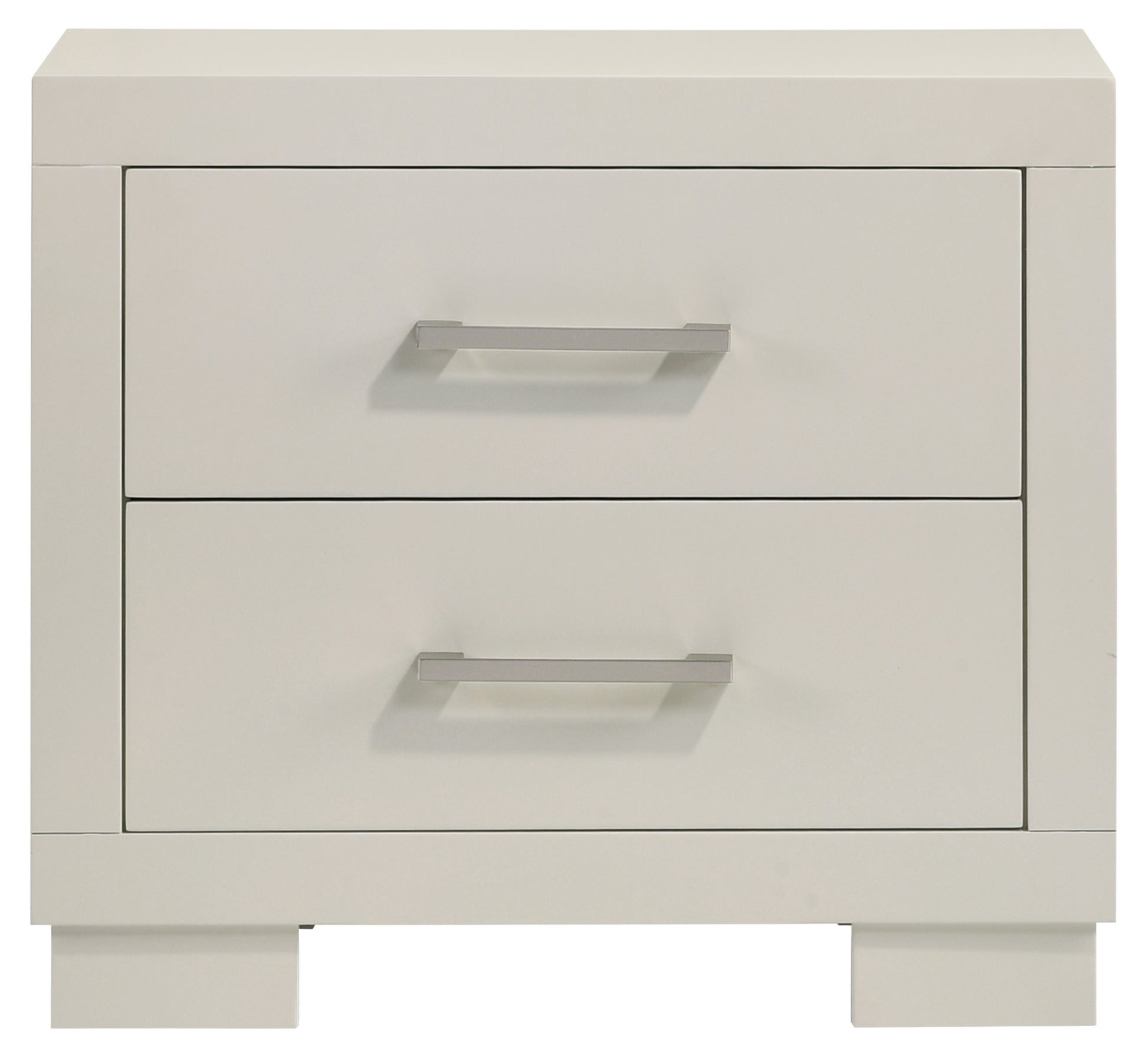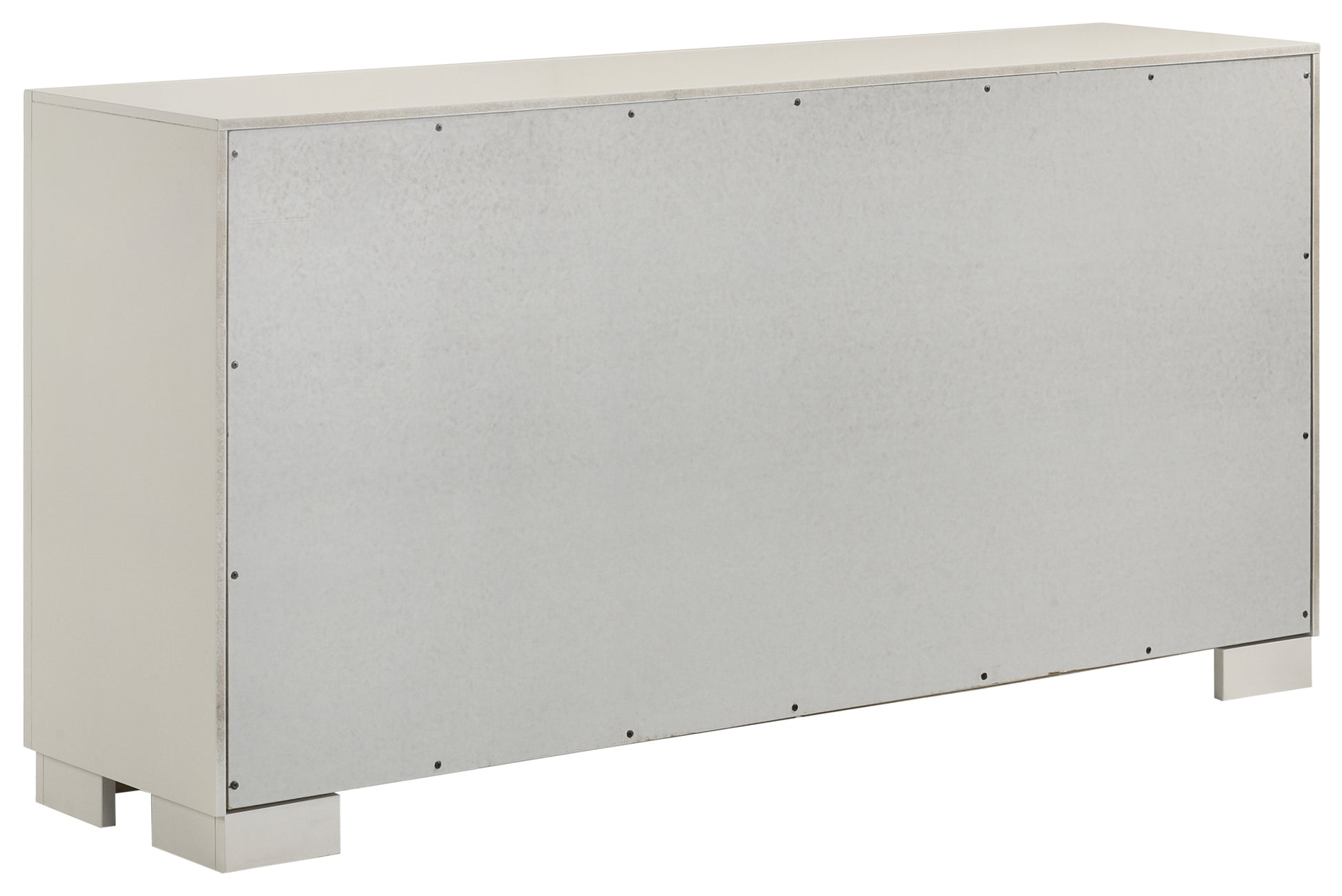 Contemporary verve reflects in the design of this crisp, modern bedroom set perfect for an updated space. Linear design creates a sharp aesthetic, adding a fresh spin to master or guest bedrooms. A stacked platform bed with wall panel attaching to nightstands becomes the marquee piece in this set that checks off all necessities. Silver finish metal bar hardware offers a standout feature, as case pieces sit atop bracketed corner feet. Set includes bed; two wall panels; two nightstands; one chest; one dresser, and one framed mirror.