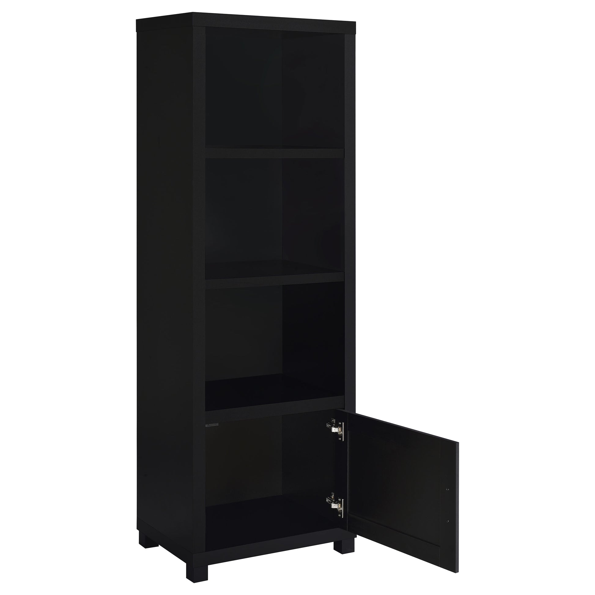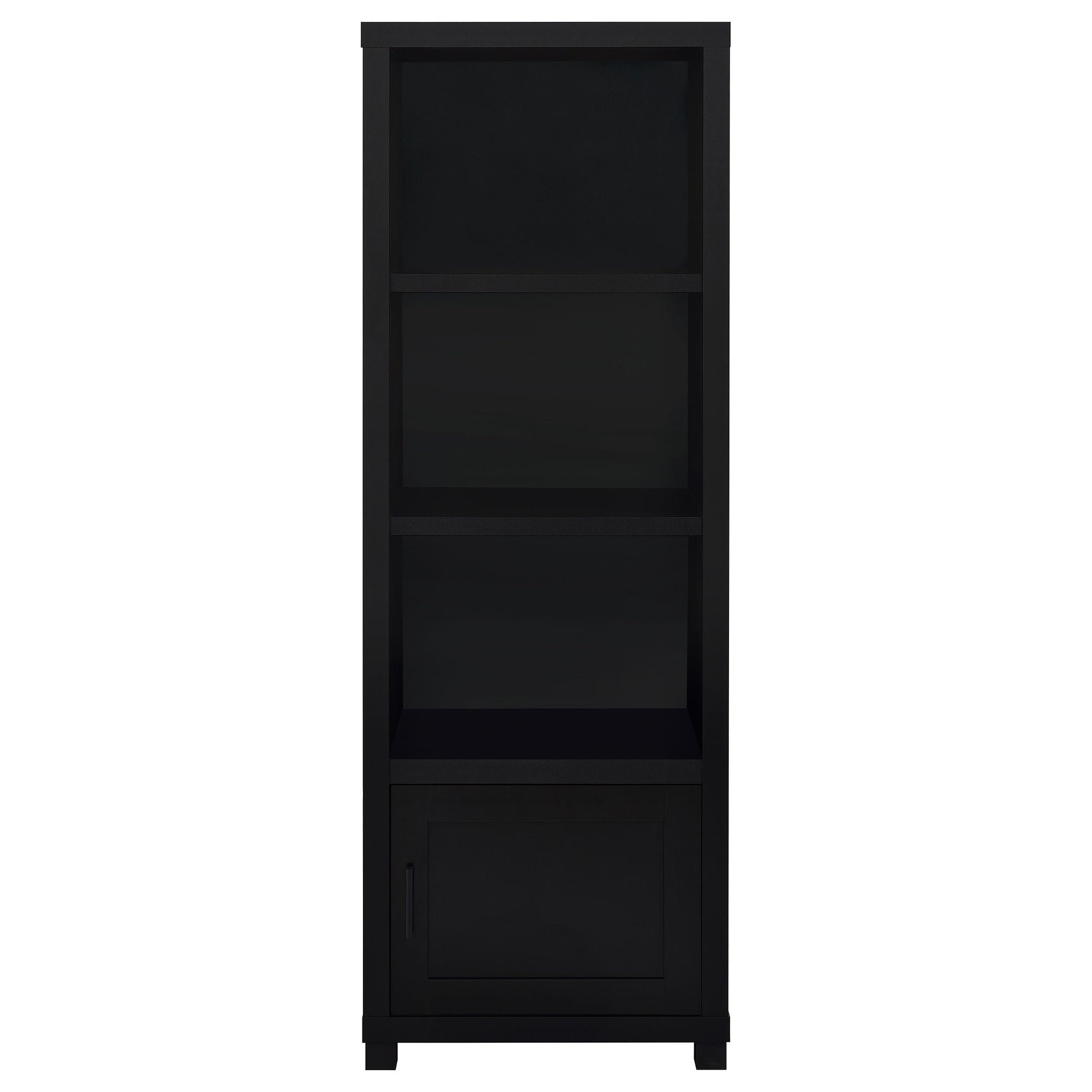 Immerse yourself in the sleek sophistication of this media tower bookcase, a beacon of organization and style. With three tiers of shelving, it presents a stage for your cherished books and collectibles, turning clutter into a curated display. Below, a single-door cabinet offers concealment for items best left unseen, its handle designed for versatility to suit your spatial needs on either side. This piece is not just a bookcase; it's a statement of functionality, wrapped in a silhouette that speaks of minimalist elegance and a commanding presence.