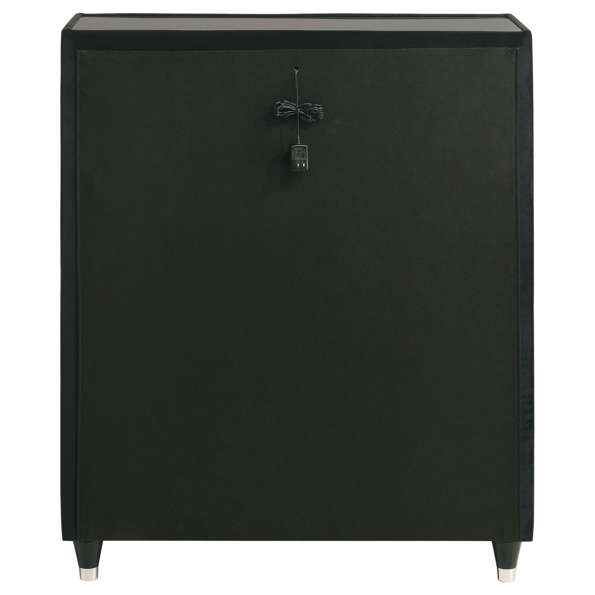 Embrace elegance in full velvet with this five-drawer chest, where ambient lighting meets refined craftsmanship. Upholstered in a stunning black velvet, each drawer is adorned with quilted textures, reflective acrylic accents, and crystal knobs for a soft yet glamorous presence. Integrated LED lighting casts a warm glow, while the black felt-lined top drawer, English dovetails, tempered glass top, and metal extension glides elevate everyday function. Supported by solid rubberwood legs, this chest blends softness with luminous charm.