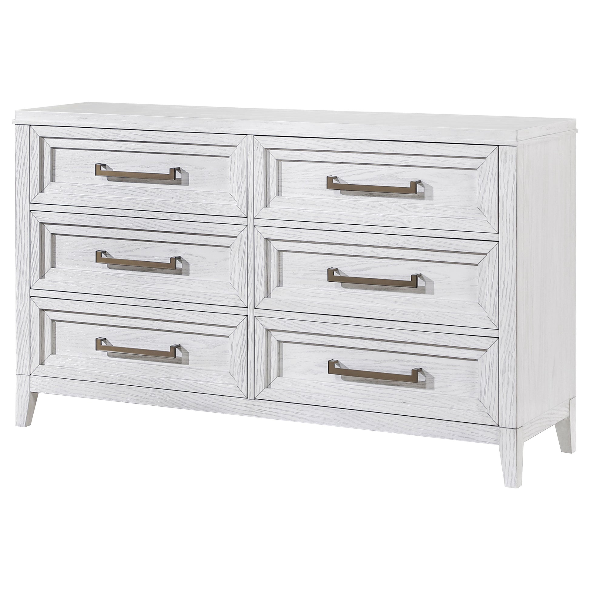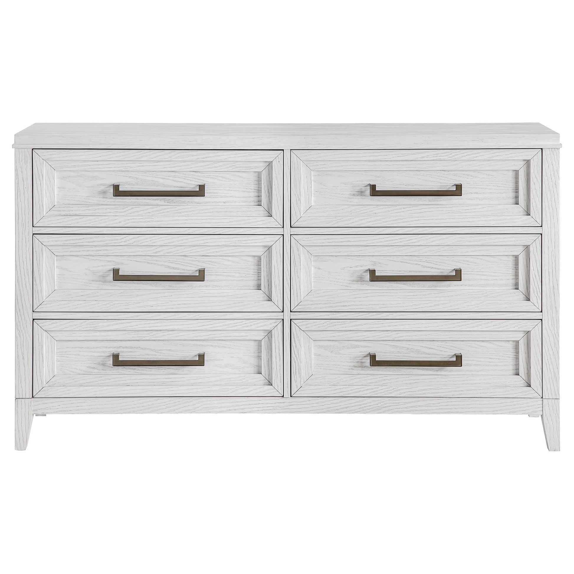 Light distressing offers depth and dimensionality to a modern six-drawer dresser. Perfect for clothing and other accessories, it features a double profile with three drawers on each side. A white finish allows wood grain details to show through, creating organic character and texture. Drawer fronts are a stepped design that adds artistry, with long antique brass toned pulls that add contrasting depth. use the wide top for personal effects like a jewelry box or valet and framed photos.