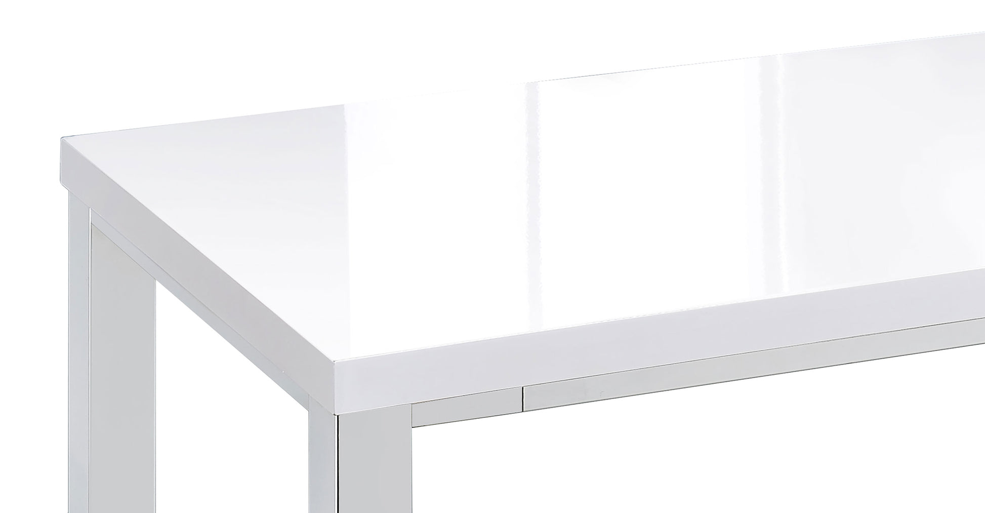 Ultra-modern with a clean lined silhouette, this five-piece bar set comes complete with a rectangular shaped bar table and four bar stools. Perfect for more contemporary home, the table comes with sleek and square legs made and a steel frame in an electroplated and polished chrome finish that lends a luxurious gleam to any room. The tabletop features a high gloss white lacquer finish and seats four people comfortable. Each stool also features a matching lustrous high gloss white seat and matching legs. One the stools are also footrests for extra support and stability.