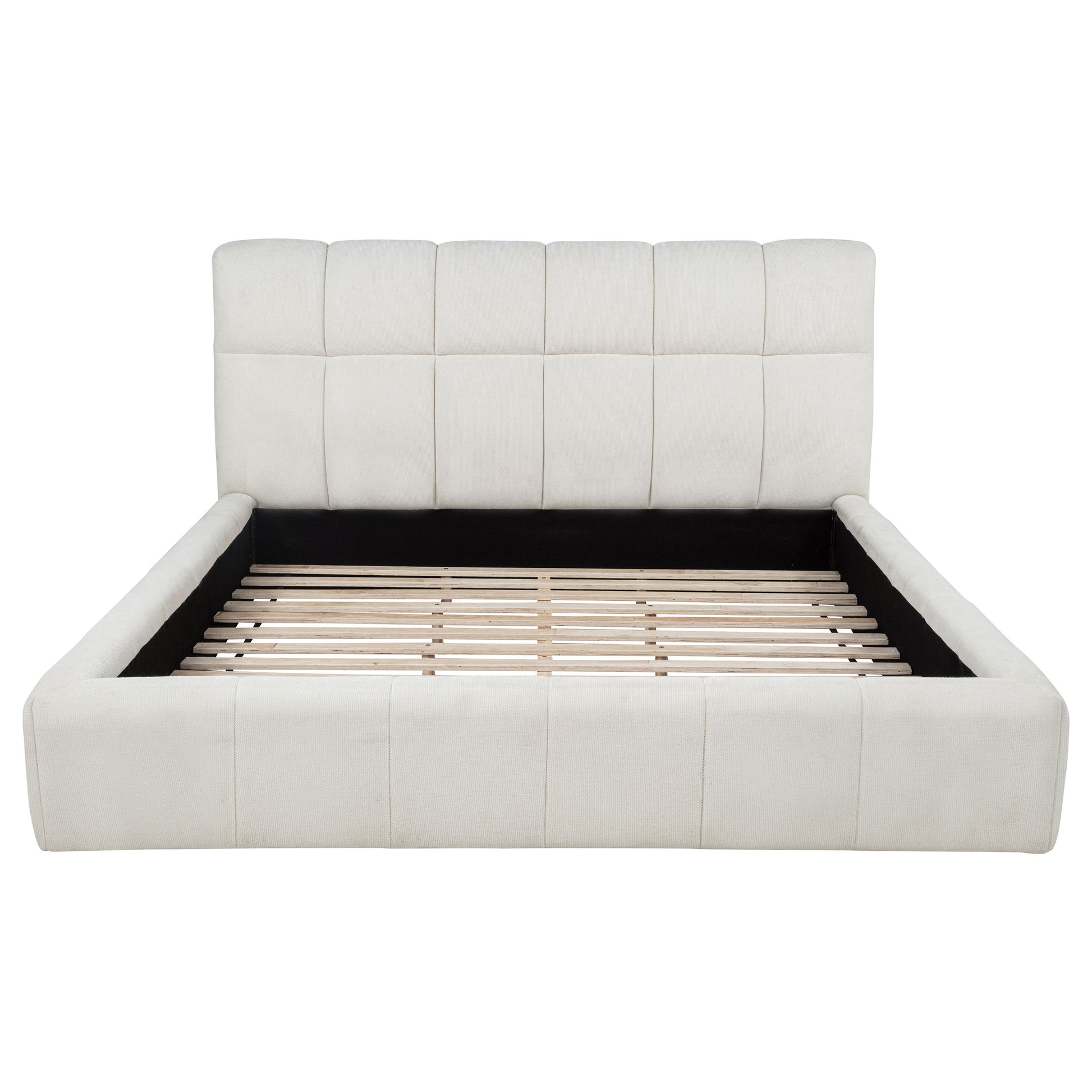Tailored with bold lines and soft texture, this upholstered platform bed blends comfort with quiet strength. Vertical channel tufting runs along the headboard and foot rails, adding dimension and rhythm to the silhouette. Wrapped in plush fabric and fully slatted for support, it eliminates the need for a foundation. Crafted from solid and engineered wood, this bed invites modern serenity into any bedroom retreat.