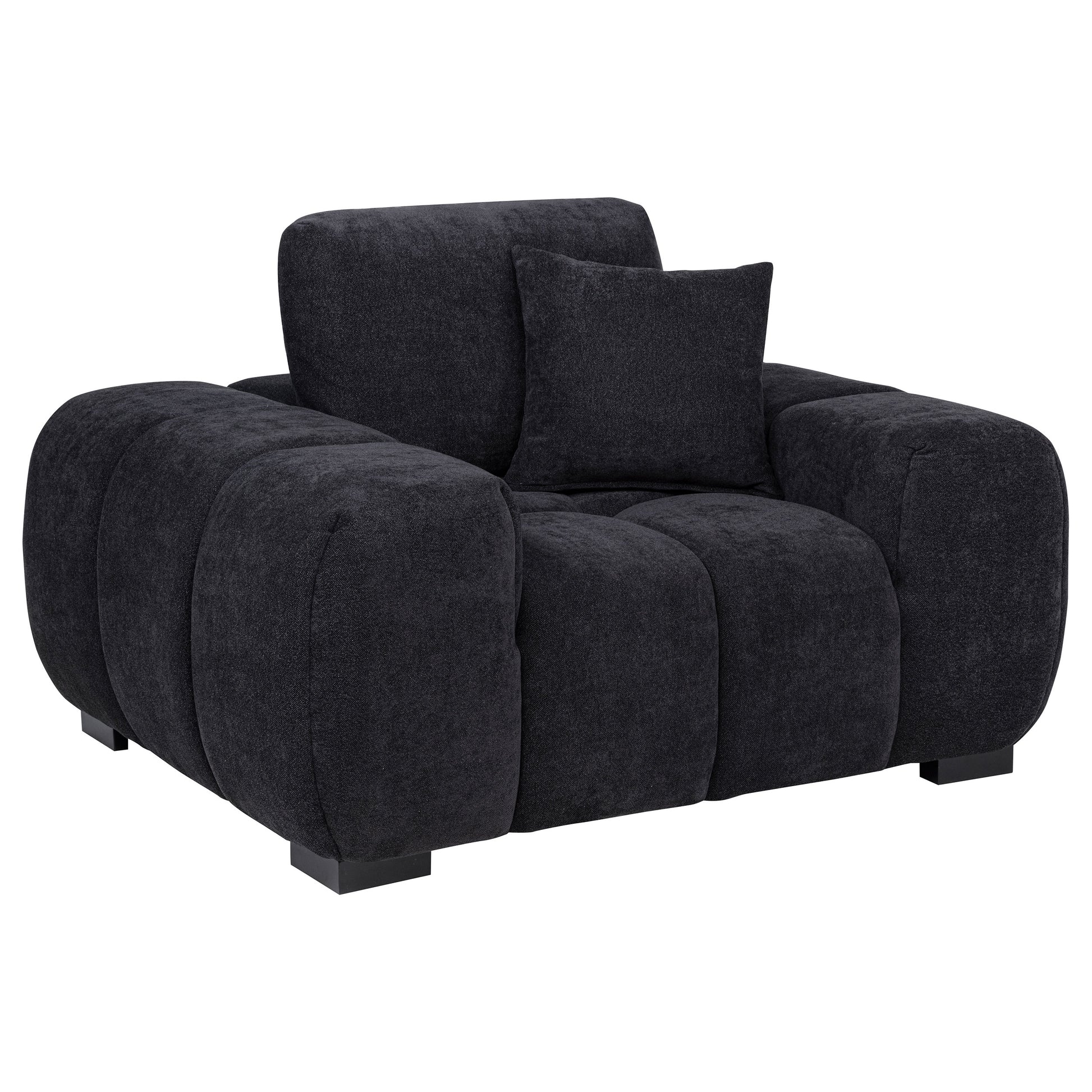 A statement of sculptural indulgence, this accent chair wraps the body in plush, enveloping comfort. Its exaggerated curves and deep channel tufting create a rhythm of softness, while wide track arms and generous proportions invite you to sink in and stay awhile. Cloaked in rich black fabric, it brings moody sophistication to any space. Crafted with care, it’s the perfect blend of artistry, comfort, and presence.