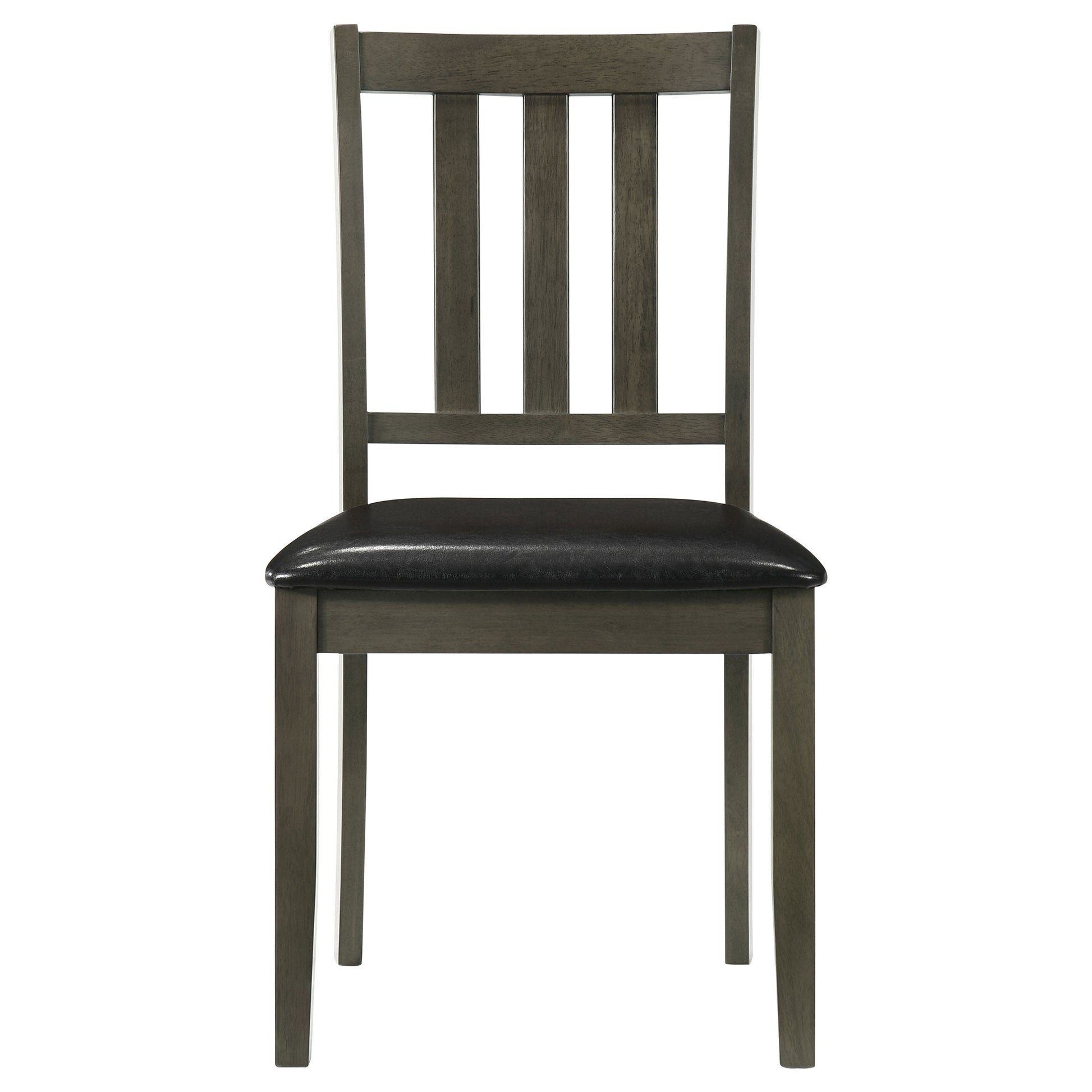 • Four chairs feature a classic slatted back and black faux leather upholstery