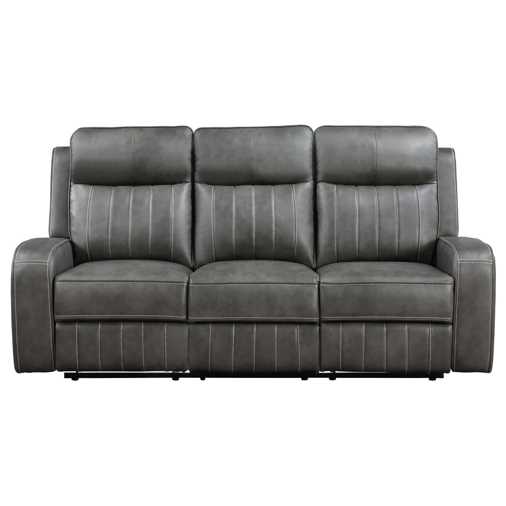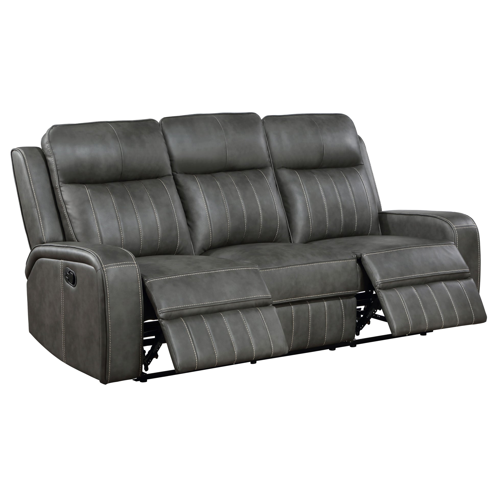 Merging the classic style of both contemporary and transitional design schemes, the two-piece sofa and loveseat set creates a dreamy venue for relaxing. The trending look of smooth grey leatherette upholstery with vertical topstitching delivers decorative elements and a dimensional impact. This motion-reclining set features foam padding on its frames and pocket coil spring seat cushions, as attached back cushions are capped with ultra-plump headrests. Recline into varying positions using a manual control function, and enjoy space efficiency with its wall-hugger design. Bonus features include a center-mounted loveseat console with a flip-top storage bin and a pair of handy beverage holders.