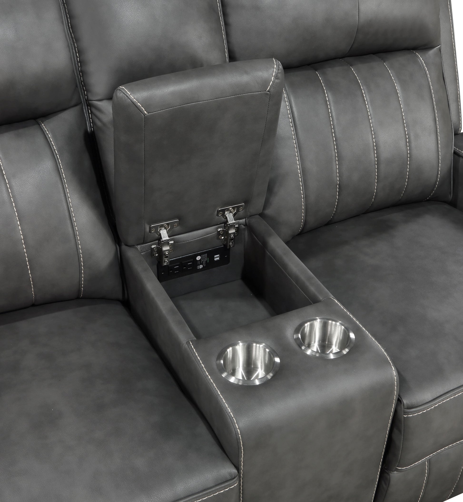 • A loveseat storage console flips open to reveal storage space for remotes and accessories