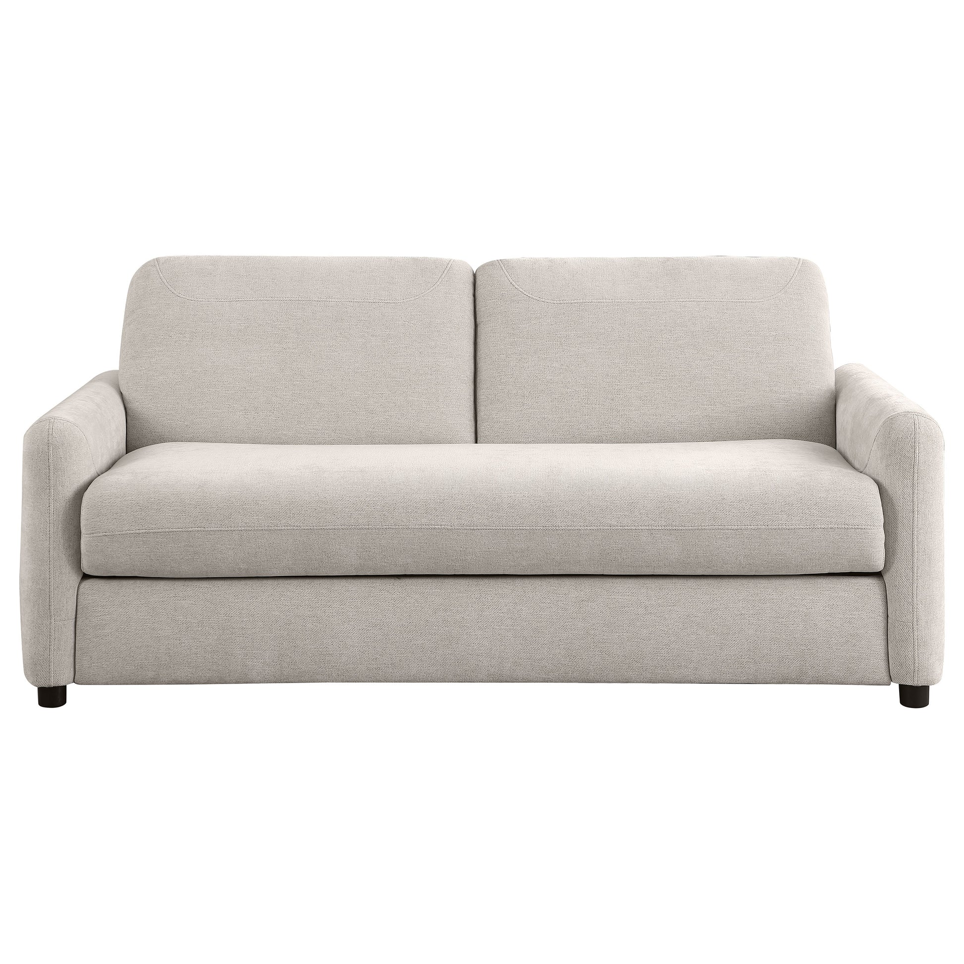 Add a versatile spin to your living space with a modern sleeper sofa that lends sleek style and optimal comfort. This functional seating solution features slender rounded track arms and bench-style seat cushions that will complement your décor. The sofa, with its soft beige upholstery and clean-lined profile, hides a convenient sleep space for overnight guests, transforming into a bed with ease in one step using a pull handle located at the top backrest. Offering comfort and support, the sofa converts to a queen-size sleep surface that includes a memory foam pad, layered over foam cushioning for a luxurious feel. The seaming details add a tailored touch to this lovely sleeper sofa, making it the perfect choice for a multi-functional home office or compact living room.