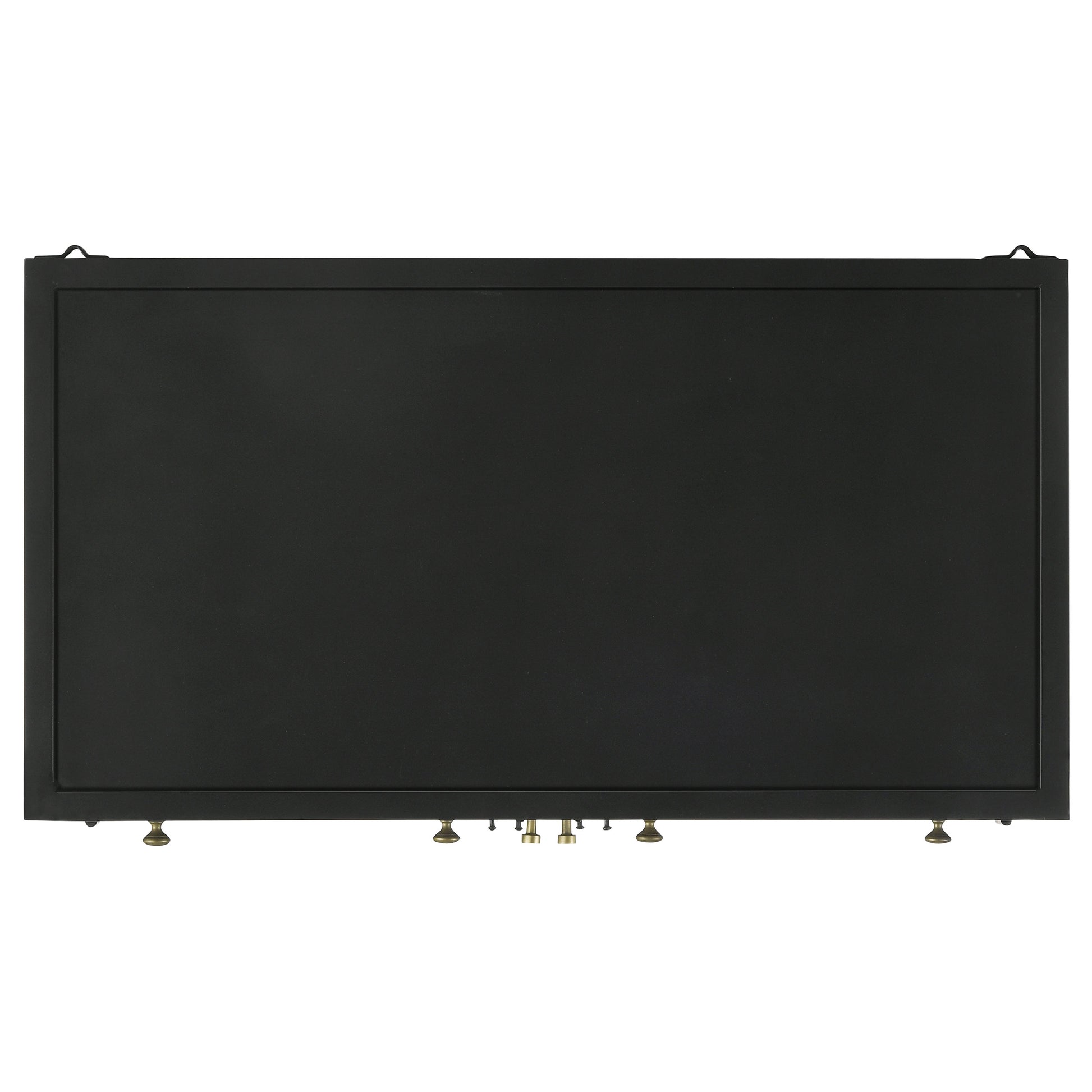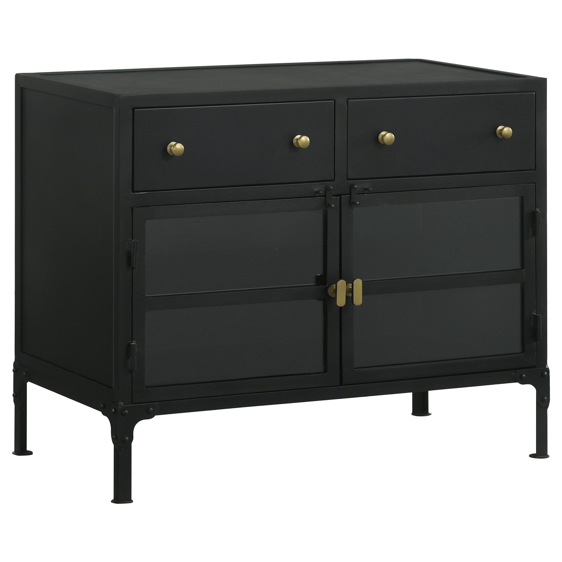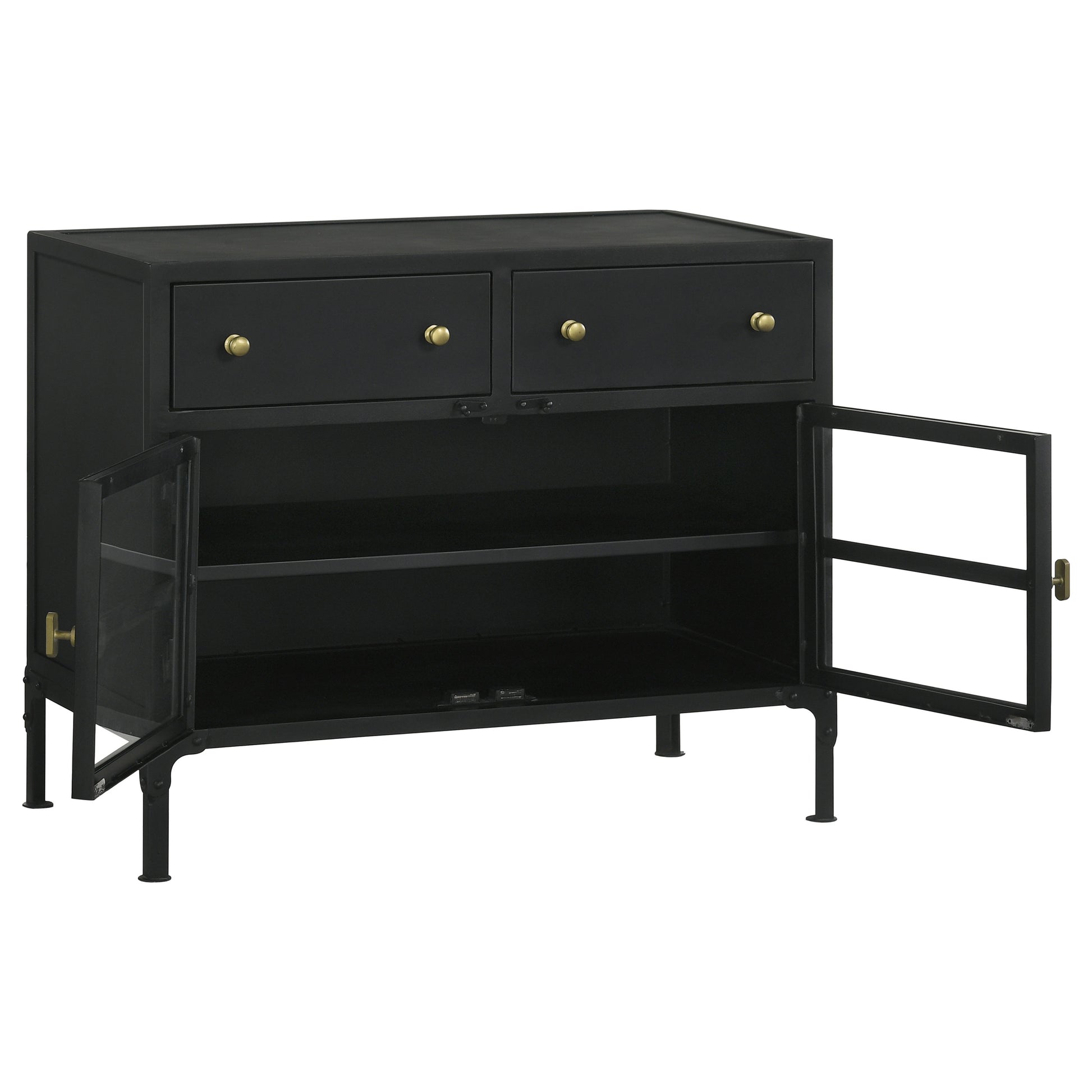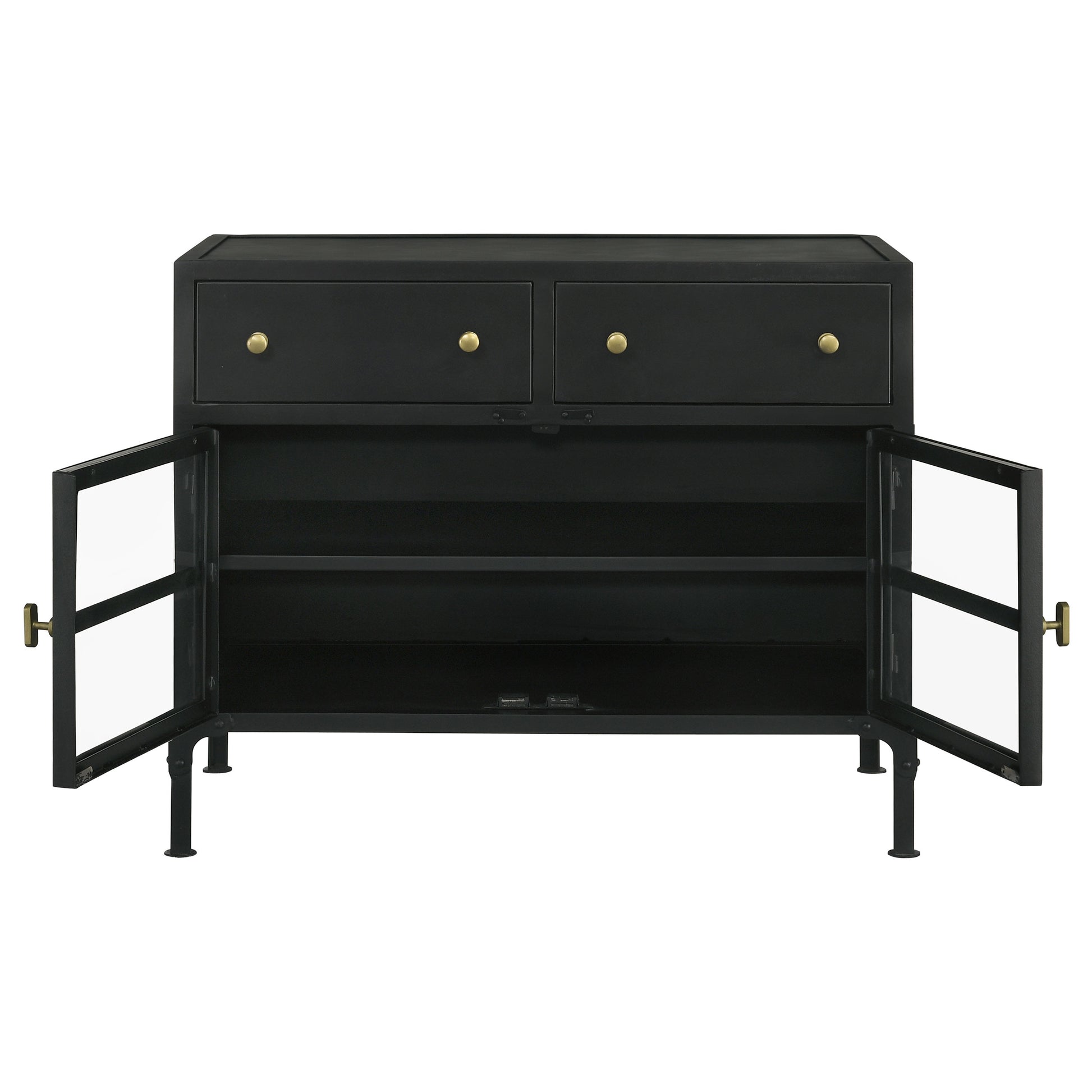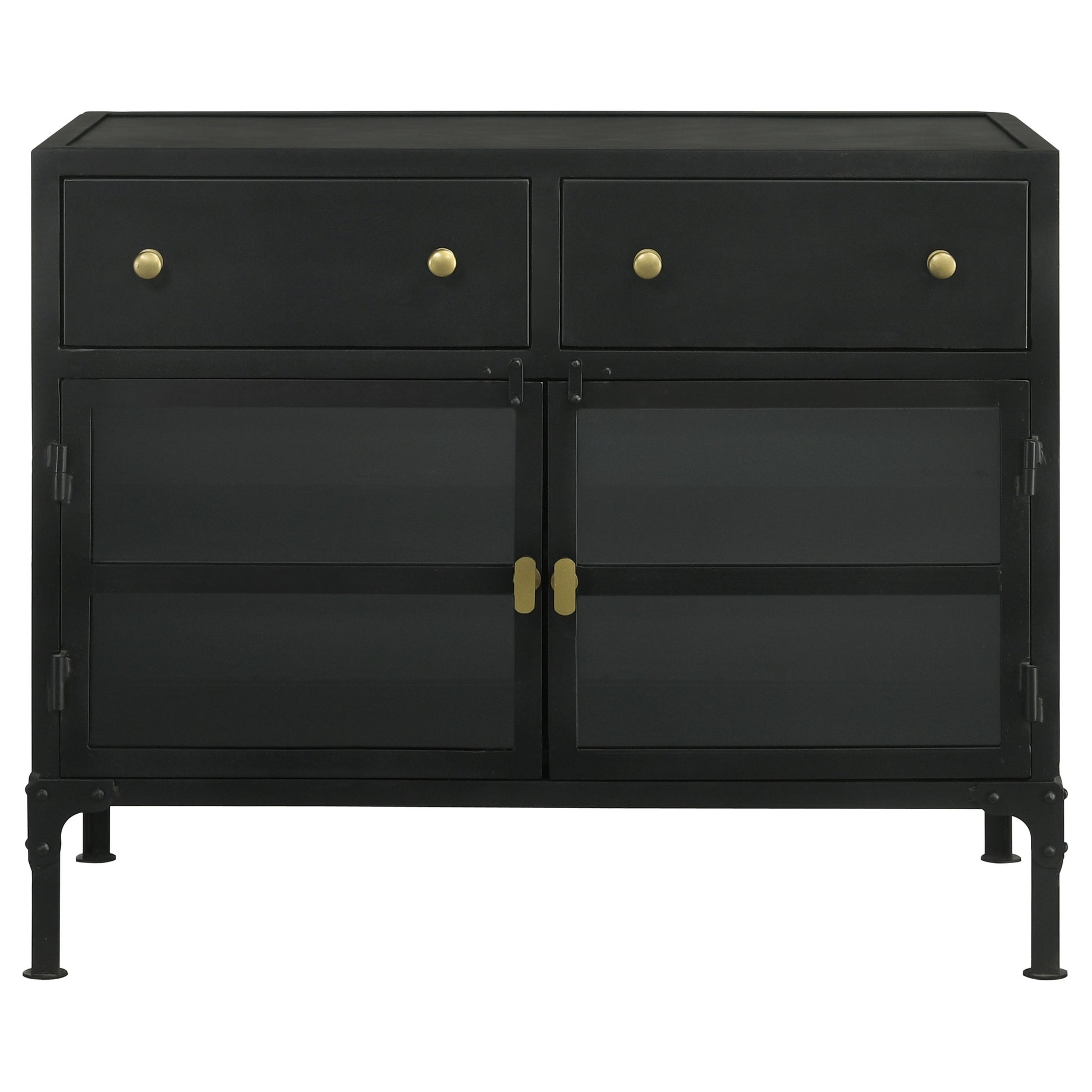 • Industrial inspired accent cabinet features a matte black metal finish and tempered glass