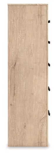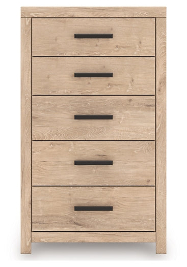 This chest of drawers brings a touch of modern farmhouse charm to your home. Its light oak finish and clean lines have a fresh, airy feel, effortlessly creating an inviting atmosphere for a restful night’s sleep. Five spacious drawers with large black handles provide plenty of storage for all your nighttime essentials.