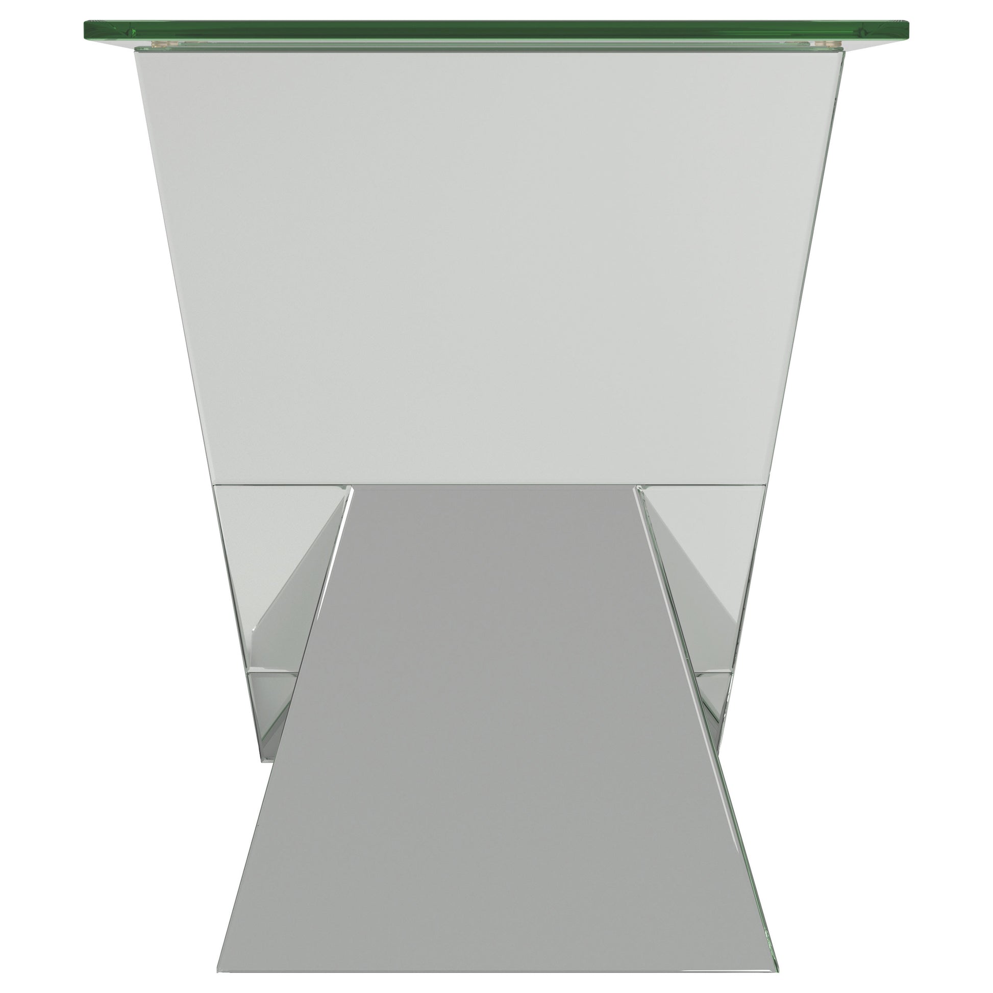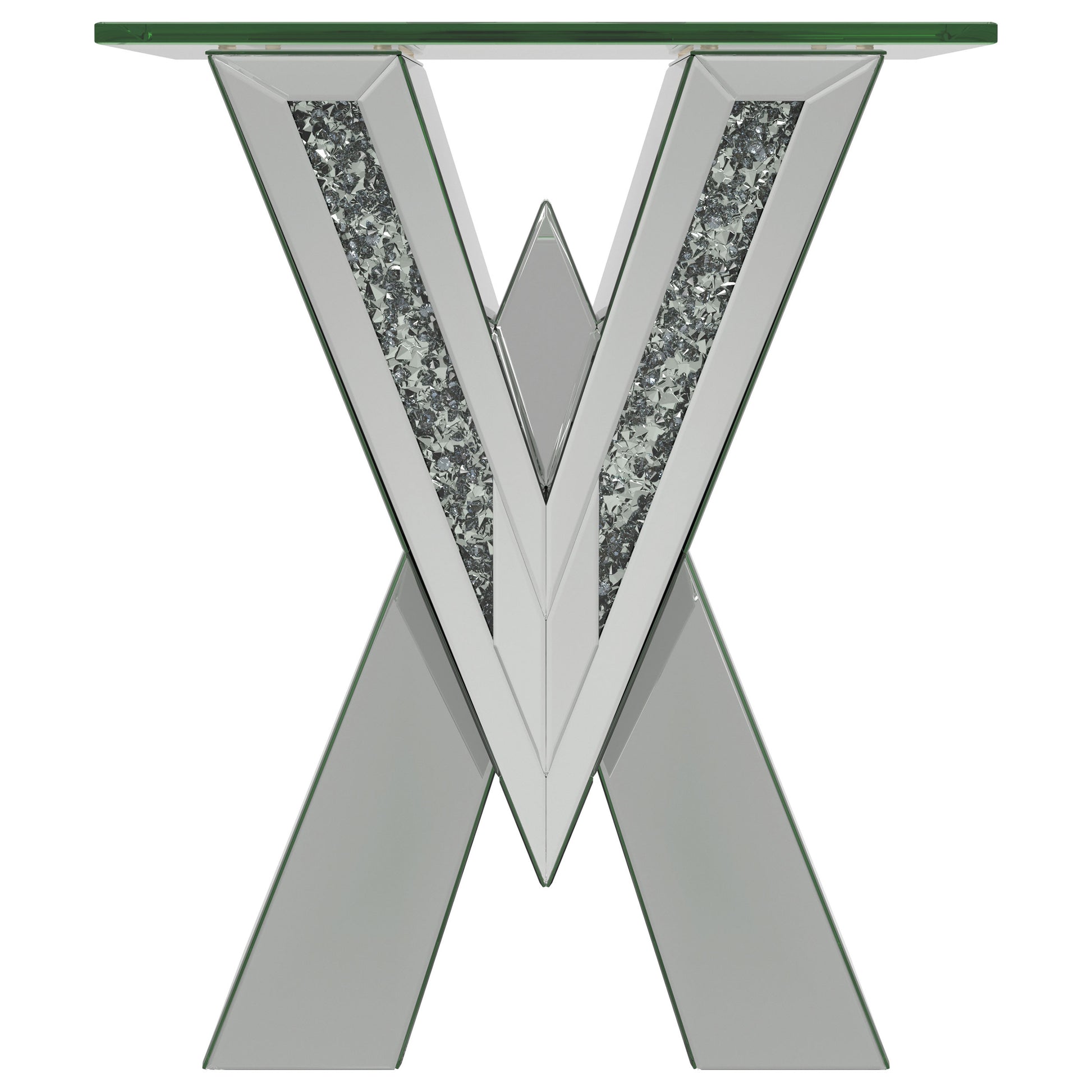 This mirrored end table brings a bold, artistic flair to any living space. Its striking V-shaped base features mirrored panels and glittering crystal accents, creating a glamorous and reflective design. Topped with a square, beveled tempered glass surface, this piece offers a perfect blend of style and functionality. The sculptural silhouette makes it an eye-catching focal point for modern interiors.