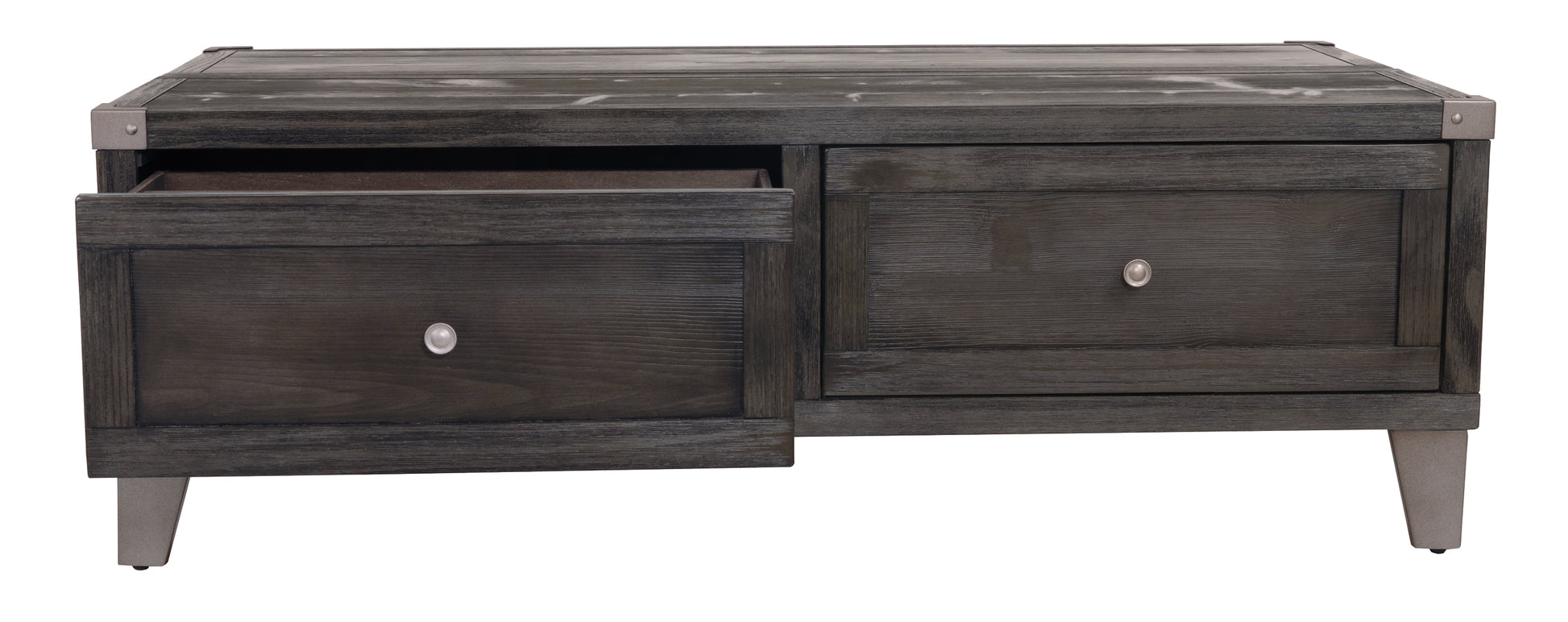 Mixed material lift top table truly elevates rustic-industrial style. Weather-washed pine wood and veneers are contrasted with canted metal legs and corner bracket accents for a uniquely chic merger of earthy beauty and contemporary flair. A handy spring-loaded mechanism brings the tabletop to you, while two drawers with removable storage trays are packed with possibilities.
