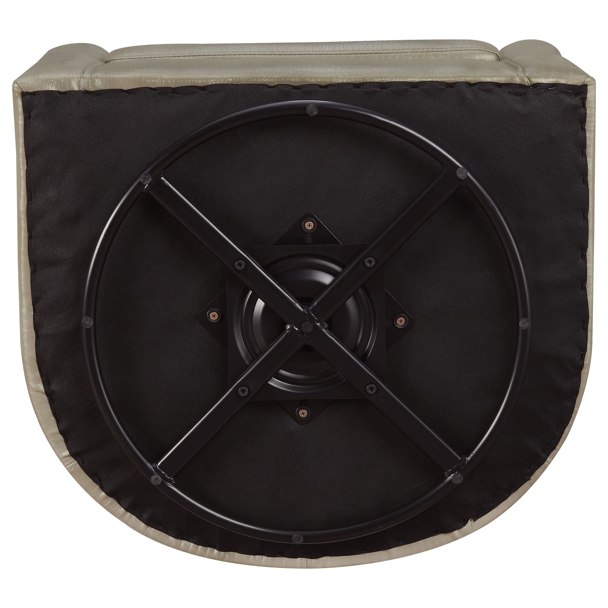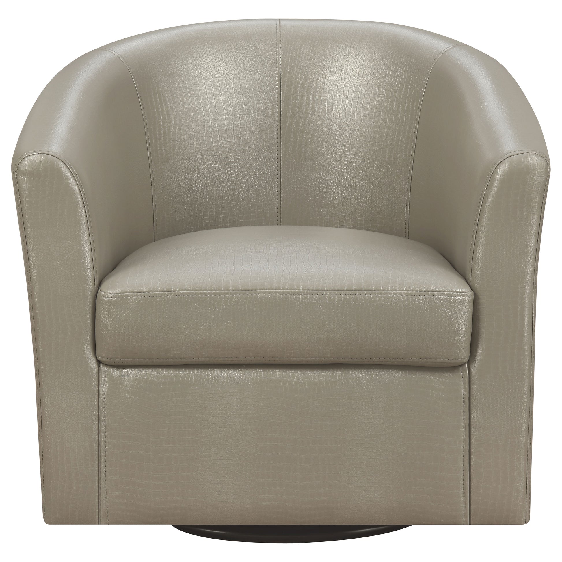 Bring a casual elegance to your contemporary living space. Comfort and style go hand in hand with this gorgeous swivel accent chair. A hint of retro design sneaks in to a barrel back minimalist profile wrapped in stunning champagne leatherette upholstery. A slight sheen gives off radiance and energy, making this chair a fresh addition to a casual space. Swivel motion provides added convenience.